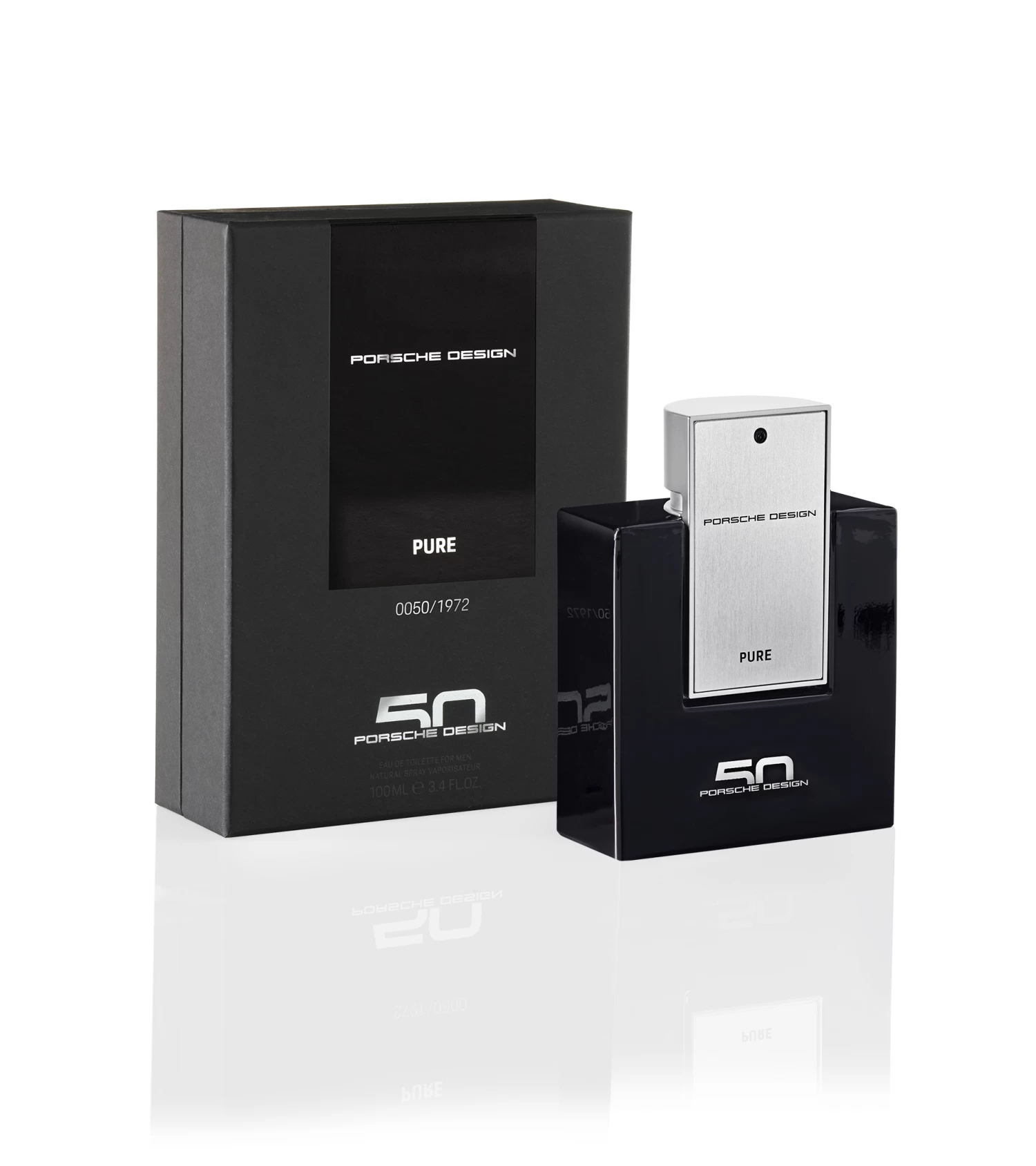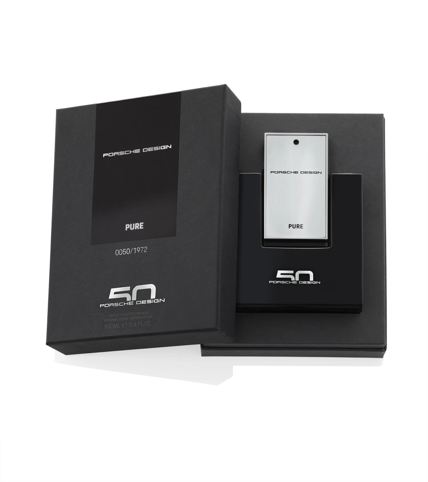 Black. Refined. Limited to 1972 bottles. Designed as a special edition, the exclusive 50Y special edition of the men’s fragrance Porsche Design Pure pays homage to the founding year of Porsche Design – and perfectly embodies the brand’s design essence. The eau de toilette exudes exclusivity and masculine purism from the clean bottle to the timeless fragrance creation itself. The signature scent flows into the top note with a transparency defined by ozone accords and fragrant grapefruit. This fragrance develops in a fascinating way – leaving a warm, masculine-elegant aura through clary sage, cashmeran and lavandin in the heart note and the base accord of sweetgum, vetiver and patchouli. The bottle, designed by Studio F. A. PORSCHE, features an engaging, high-quality combination of deep black lacquered glass with brushed aluminum. The construction is technically inspired as you’d expect from Porsche Design: the innovative pump mechanism with aluminum front is integrated flush and slides vertically in the glass cuboid. A transport clip protects the fragrance when traveling or in your gym bag. The limited edition bears the silver 50Y Porsche Design logo on the bottle, and the individual limited edition number of each fragrance can be found on the bottom of the bottle and on the accompanying black gift box.