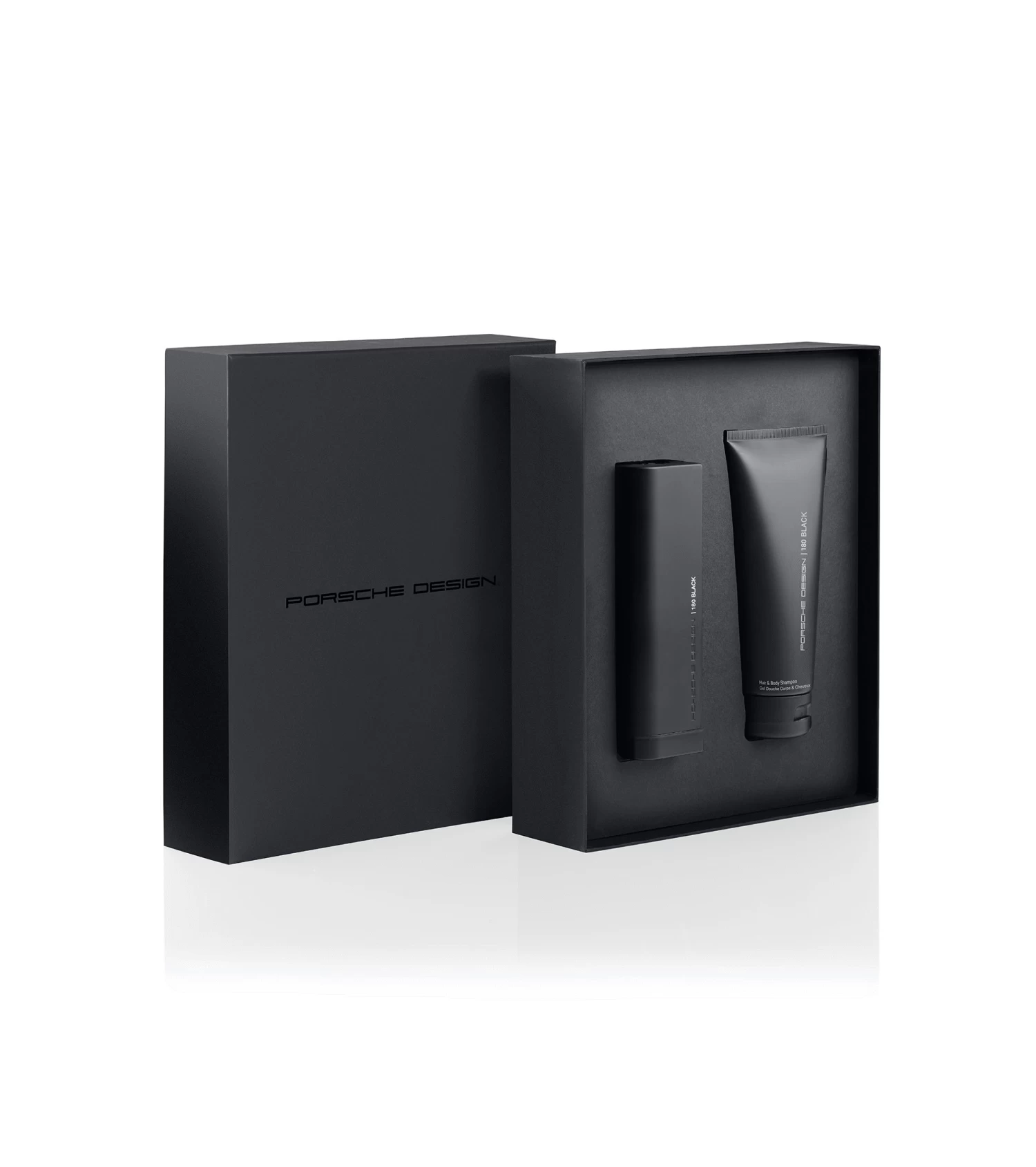 The duo for maximum performance: in the Porsche Design 180 Black gift set, comprising the 100 ml Eau de Toilette and 200 ml Hair & Body Shampoo, Porsche Heritage meets modern lifestyle, elegance meets technology, immediately tangible dynamism meets a long-lasting impression. The exclusive, aromatic fougère fragrance shines from the outset: fresh grapefruit and pink pepper set off the sweet heat of cardamom. This feeling of vitality is carried through in the elegant aromatic heart notes of sage, ginger and lavender and accentuated in the base note by classic, masculine cedar and vetiver accents. Stimulating and memorable – with this combination of shampoo & shower gel and refined, designer men’s fragrance, your day is already off to an unforgettable start. The gift set is presented in an elegant matt black box.