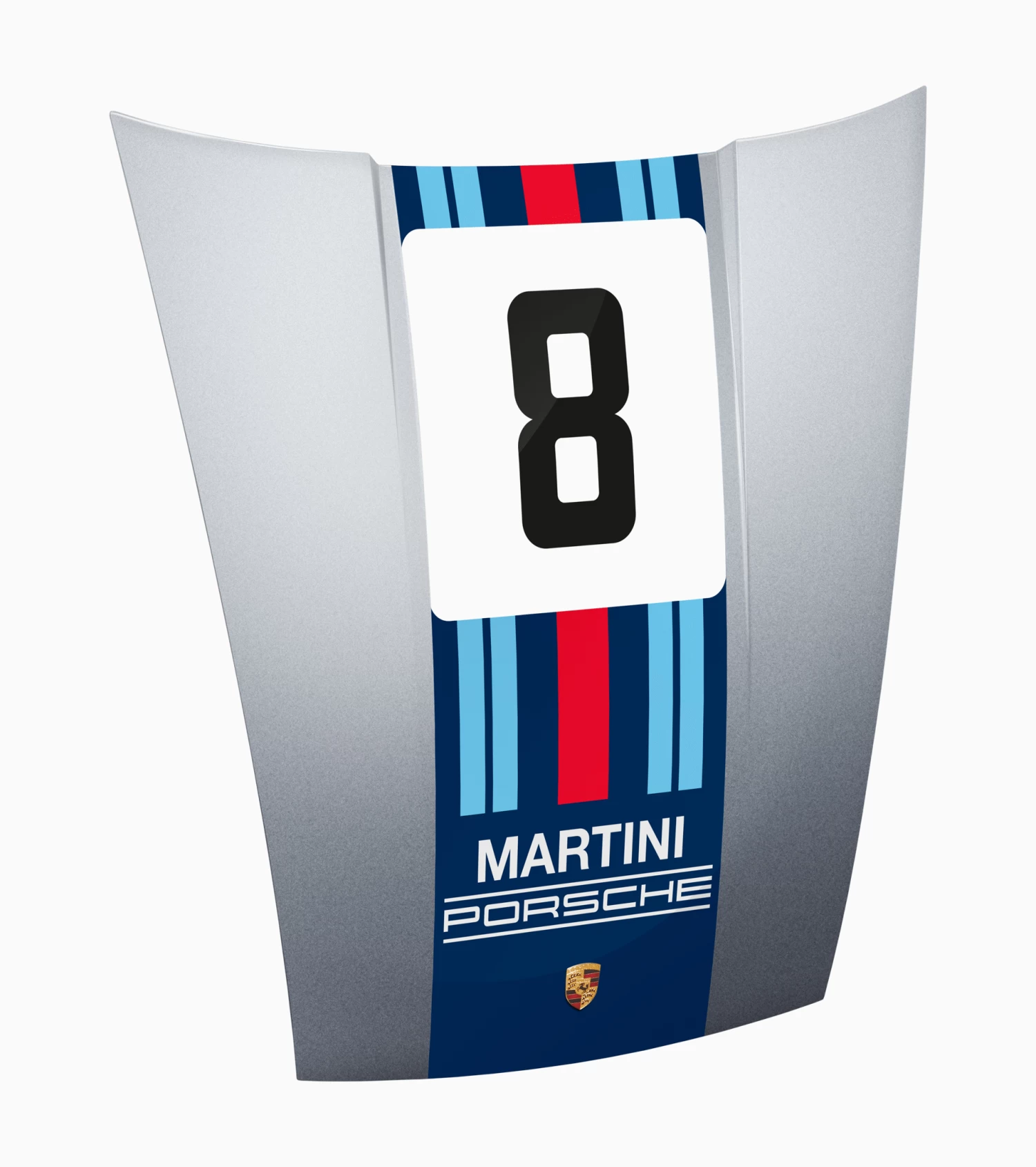 A piece of Porsche history – for your home. The original front hood of the historic Porsche 911 (G-model) in MARTINI RACING® design with starting number eight, as well as an original, historic Porsche crest is not just an impressive decorative object, but also a stylish magnetic wall.