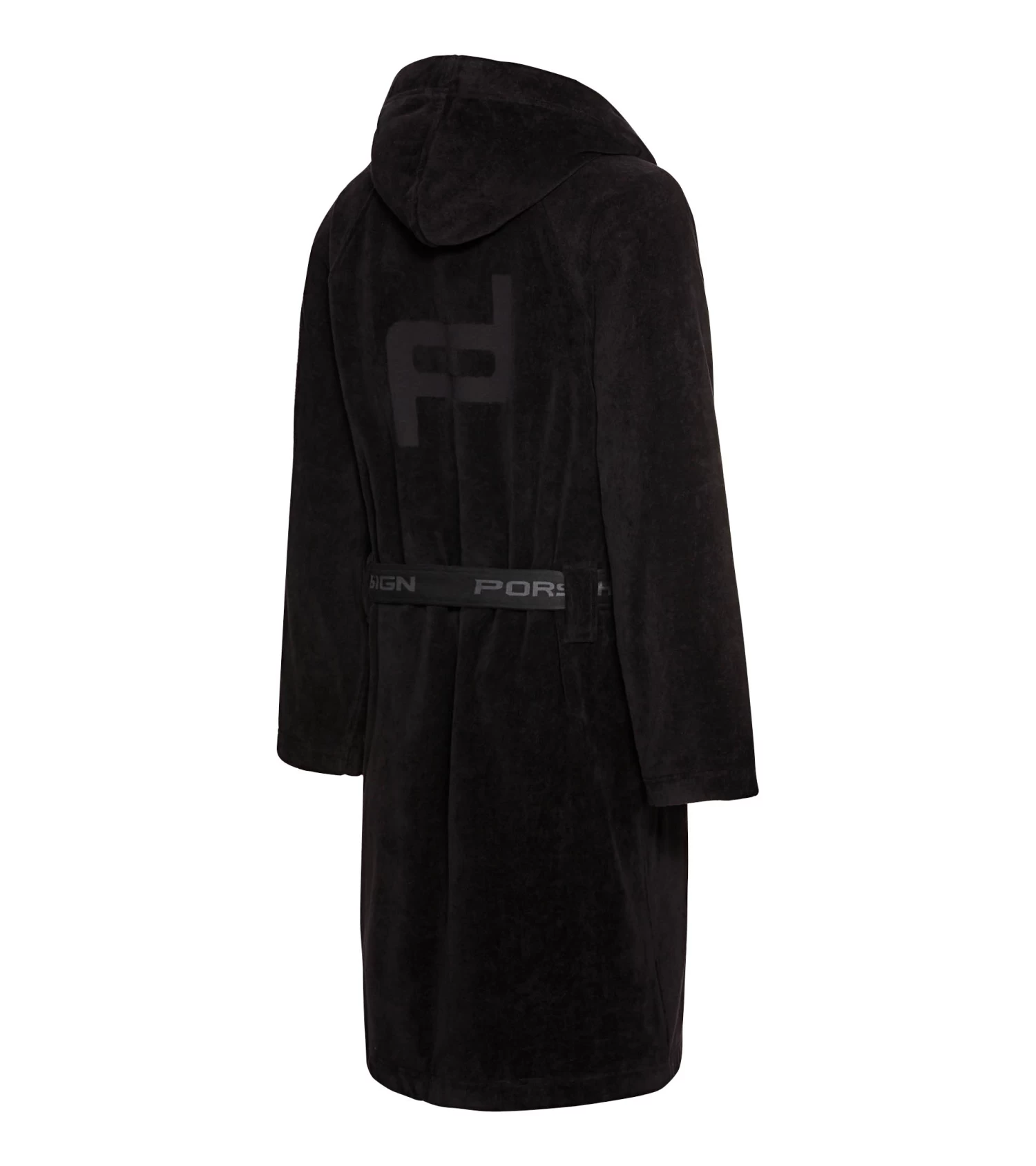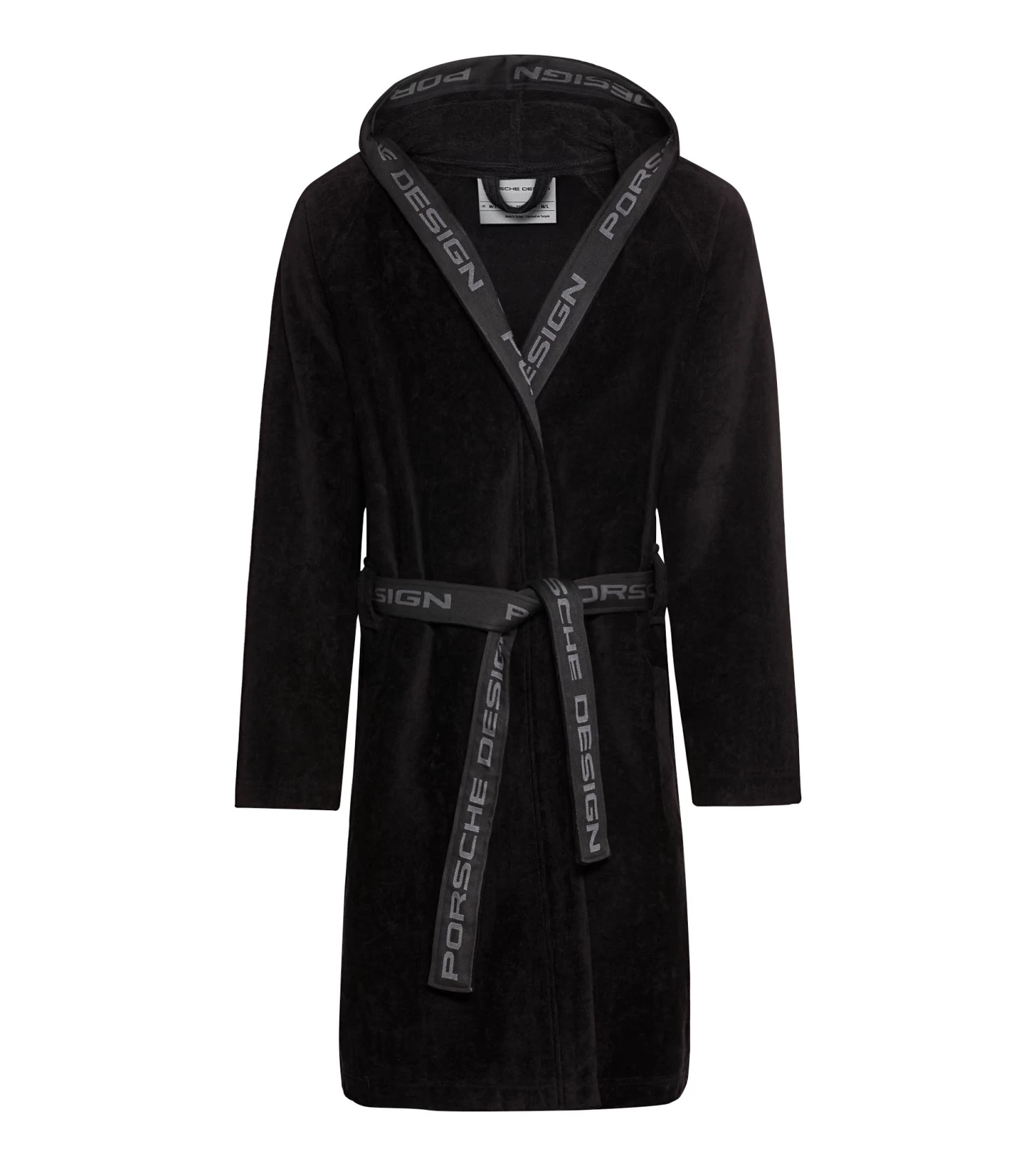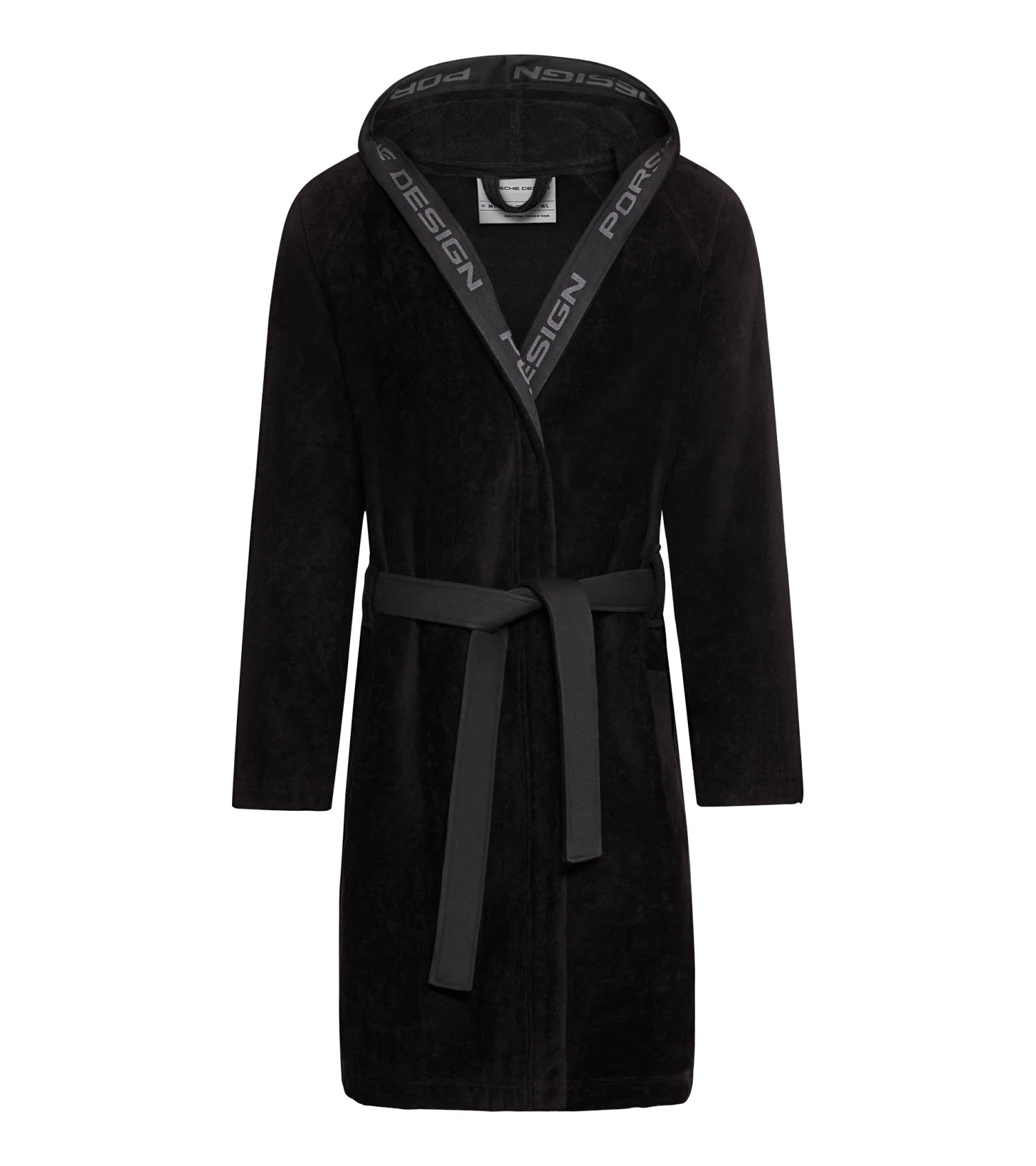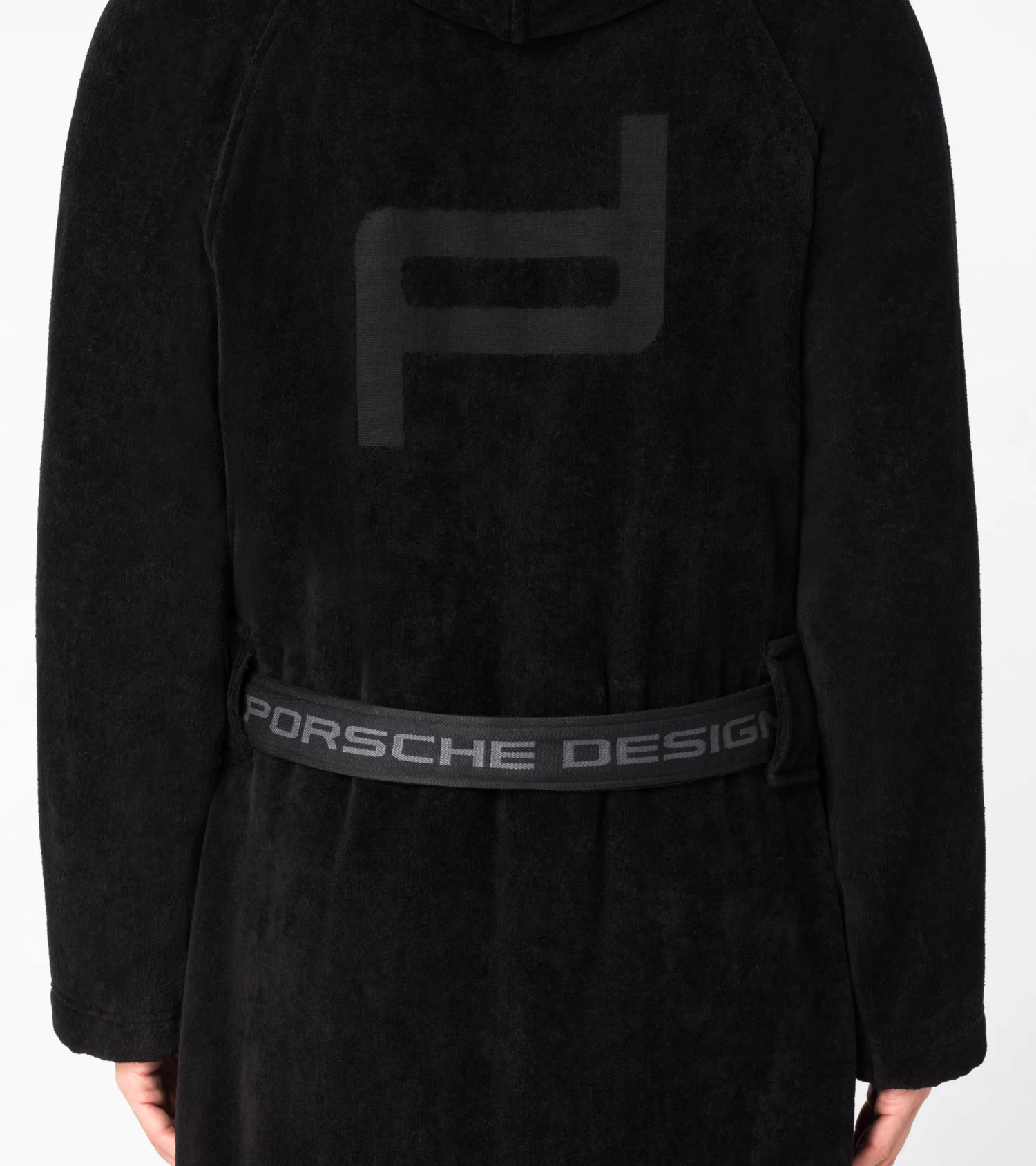 The bathrobe that combines comfort and dynamism: the Porsche Design Bathrobe made from high-quality terry velour is minimalist in style, maximalist in comfort, and unmistakably exclusive. A woven PD icon on the back emphasizes the quality of the soft material, Porsche Design logos on the inside, on the hood, and on one side of the belt give the straight, knee-length cut with raglan sleeves and angled side pockets a visible exclusivity. Perfect after the gym or in the sauna. Whether you wear the bathrobe with the solid color belt or with the logo on display is a matter of taste. One thing is sure: you will wear it often and you’ll enjoy every minute.