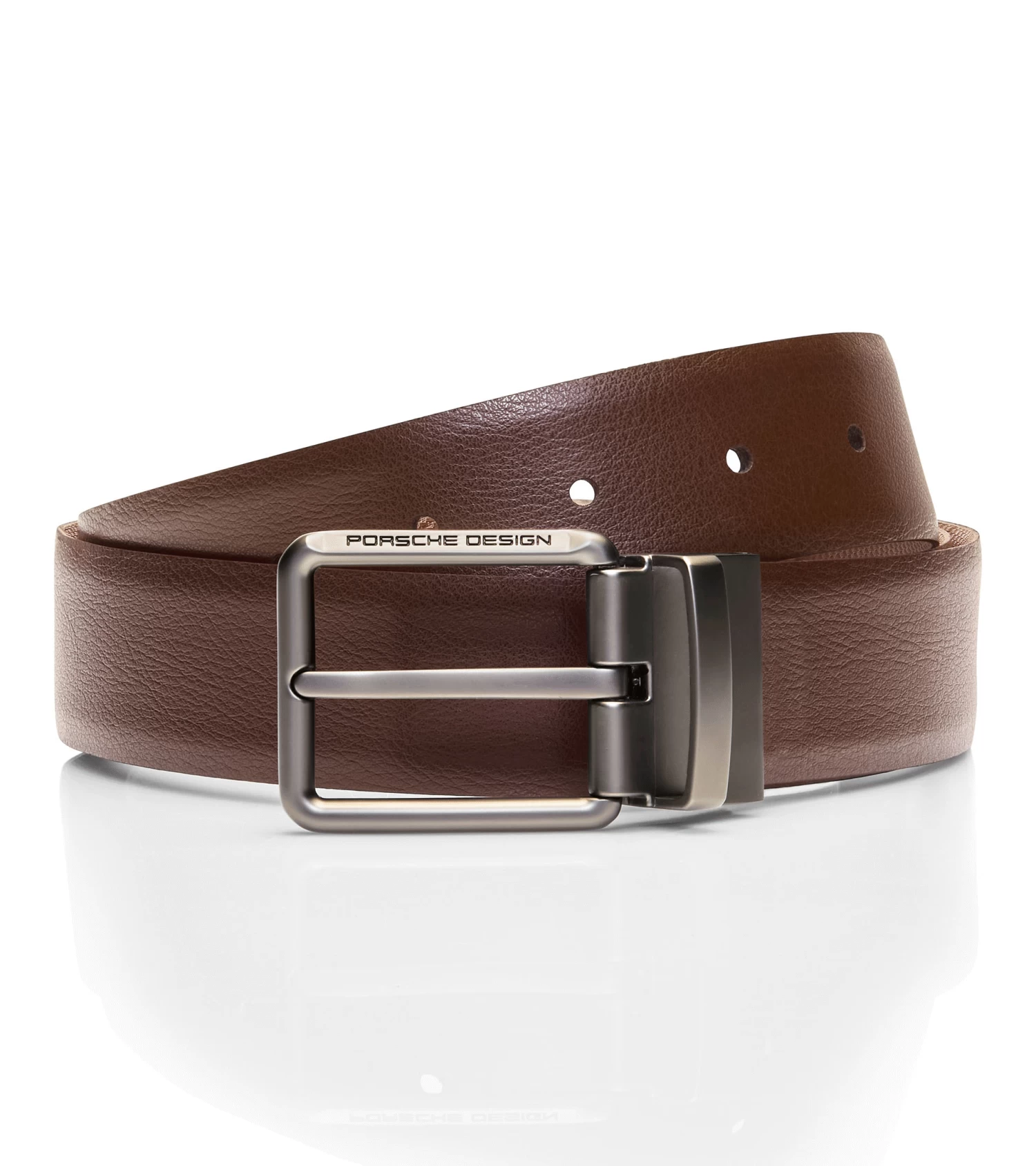 One belt, two ways to wear it: The stylish Porsche Design reversible belt made of exclusive Italian leather can be worn differently to match any outfit. The basis for all the options is smooth black leather and the second option offers a choice between black or dark brown with a subtle textured surface. A matt brushed pin buckle in titanium color with a Porsche Design logo engraving adds that extra something to this belt, making it a versatile accessory for everyday wear.