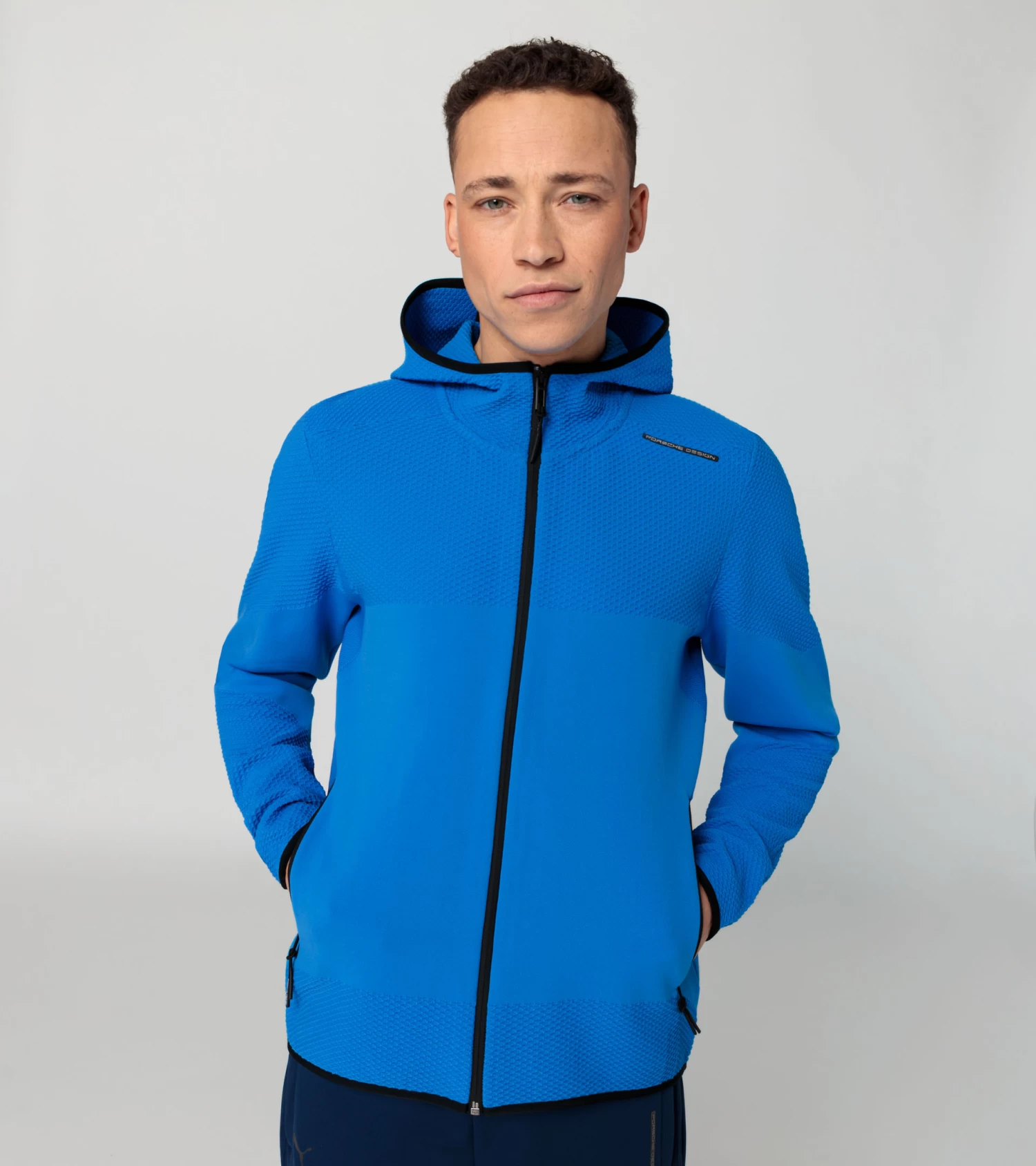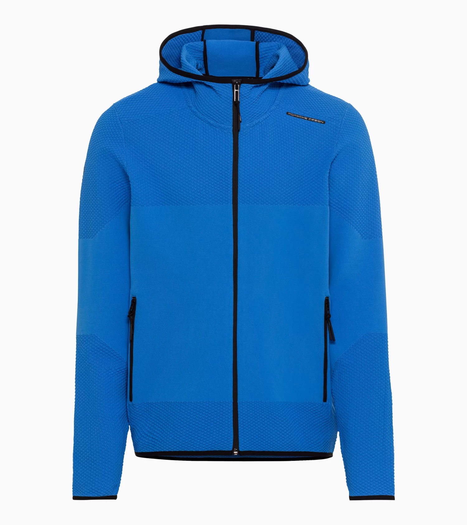 The EvoKNIT® midlayer jacket brings together a functional sports jacket and exclusive statement design. With the graphic 3D knit inspired by the hexagon structure of the GT3 Touring, the stand-up collar in the hood and its seamless body design, it already achieves a clear top performance in terms of looks. Elastic cuffs on the sleeves, hem and hood also ensure great comfort and freedom of movement. The jacket has two zipped hip pockets. The Porsche Design pullers on the front zip and pockets set distinctive accents.