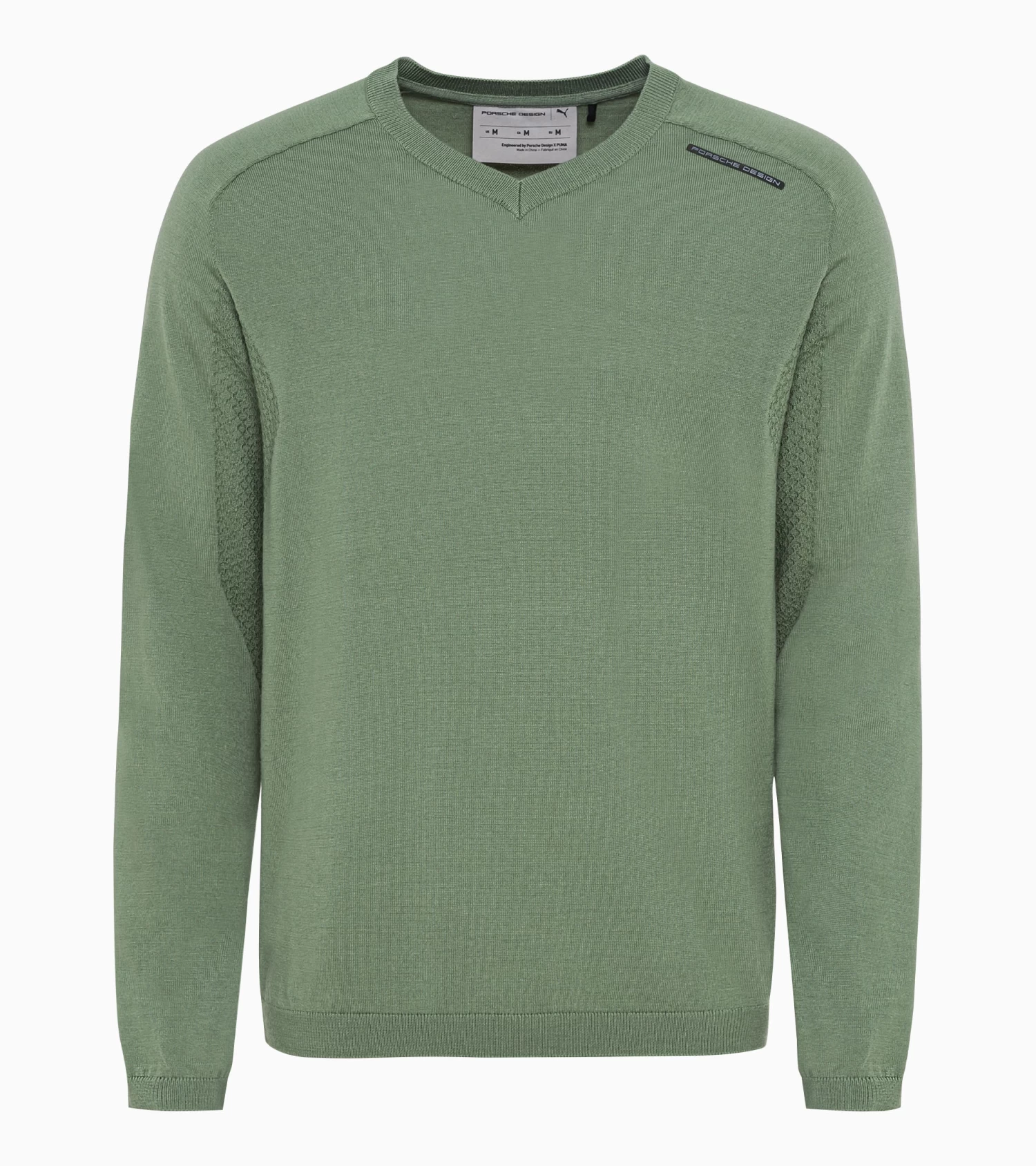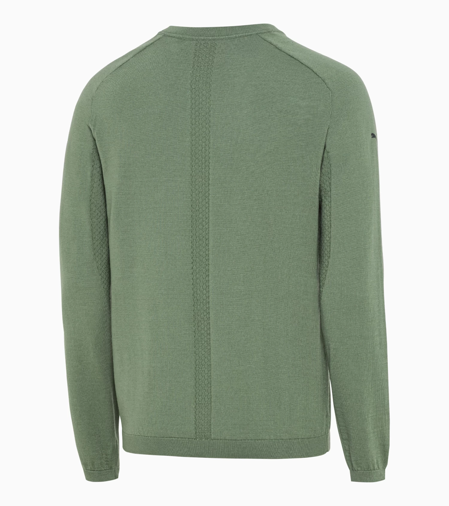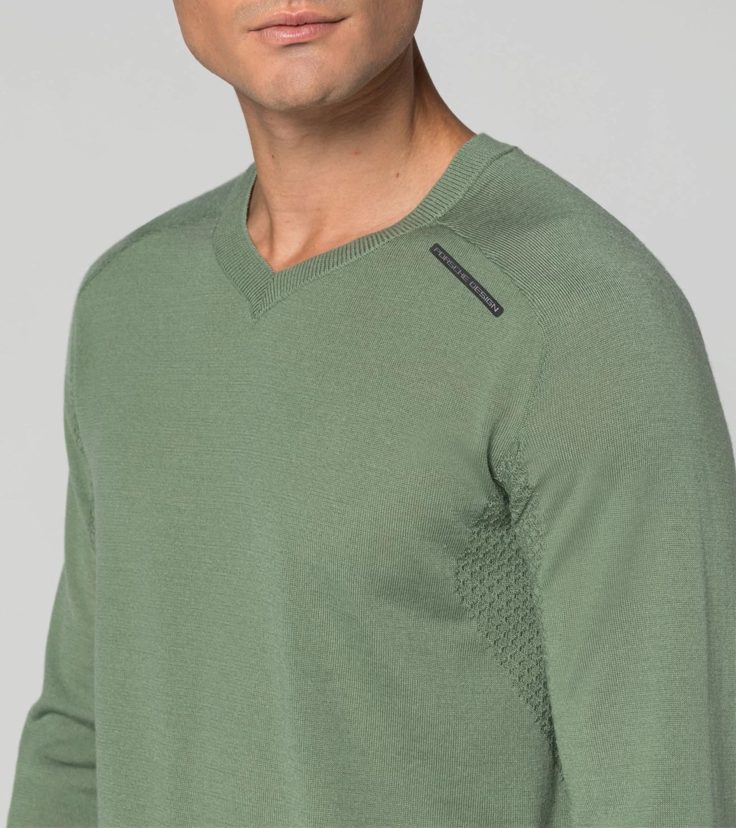 A potential classic for anyone who doesn’t wear classic pullovers: the Porsche Design EvoKNIT® V-neck made from high-performance knitted fabric takes the evergreen V-neck pullover to a new level. The innovative EvoKNIT® technology combines the comfort of the high-quality fabric, made from warm merino wool and recycled material, with functional, seamlessly knitted-in ventilation zones in a mesh structure under the arms and on the back. The lines inspired by Porsche Motorsport give the sweatshirt a dynamic character, supported by a movement-optimized raglan sleeve construction and details such as knitted cuffs and the contrasting Porsche Design logo. The definitive pullover.