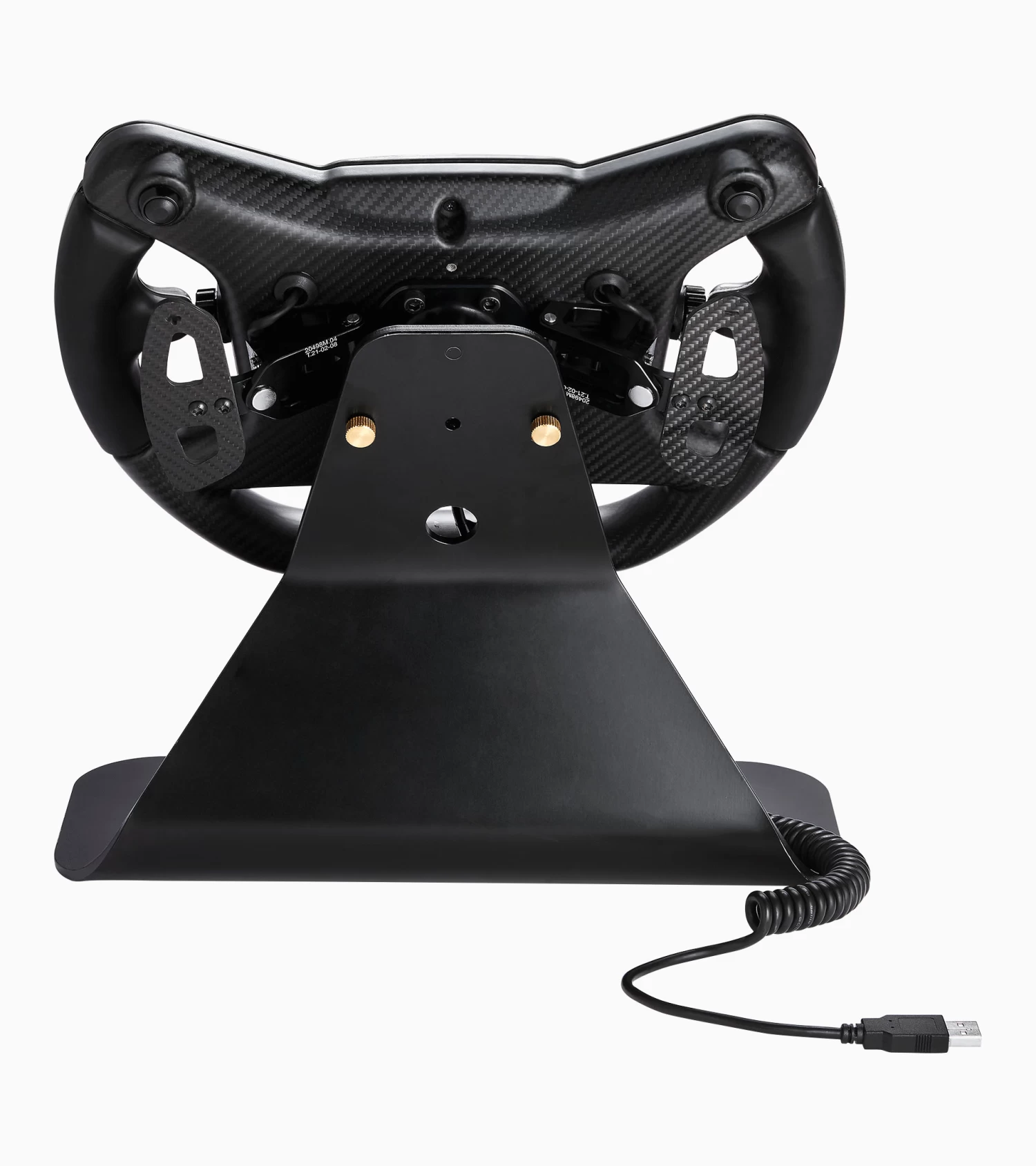 The Porsche Gaming Steering Wheel is an original 911 GT3 Cup steering wheel, fully ergonomically optimised and developed with Porsche engineers and GT drivers. From the original manufacturer and made using original materials – for the original racing feeling. The durable materials have proven themselves suitable for years of use on the race track and also ensure excellent grip. The extreme rigidity of the wheel makes every vibration, curb and bump in the game highly realistic, while the low weight guarantees great responsiveness. This makes the steering wheel suitable for passionate gamers as well as for cup drivers or teams who want to improve their performance on the road. The wheel is equipped with a USB port and plug-and-play compatibility for use with major PC simulation games. The standard spacer fits most common wheel bases. The steering wheel housing is made of high-quality carbon and features premium satin paintwork. The twelve buttons on the front and two on the back all have functionalities, just like in the real GT3 Cup. The keys can also be backlit via a power bank or a socket, with the brightness freely adjustable. The gaming steering wheel is limited to 150 units, making it an exclusive collector’s item. It comes with a matching stand, designed by Studio F. A. Porsche, which features a limited-edition plaque.