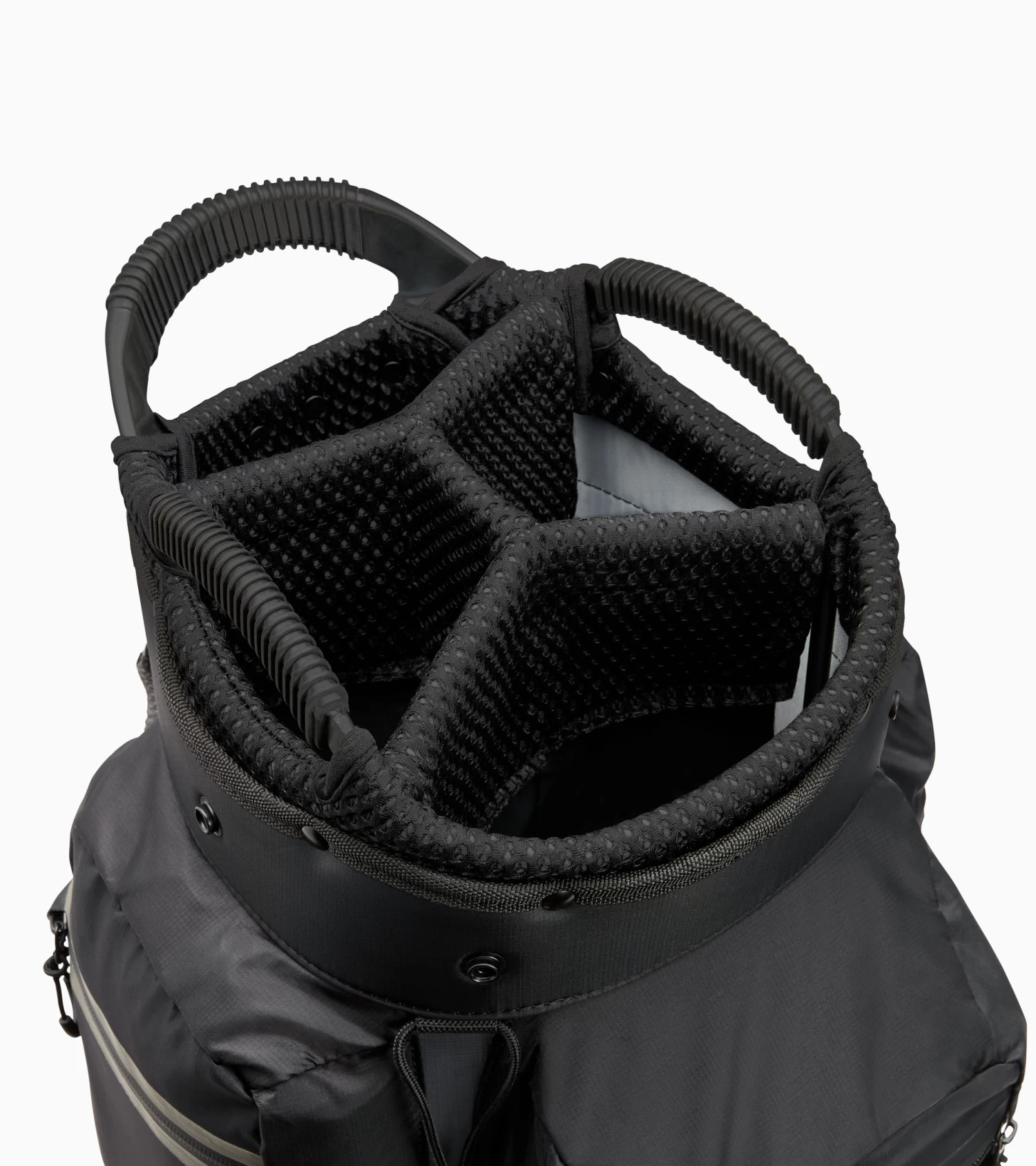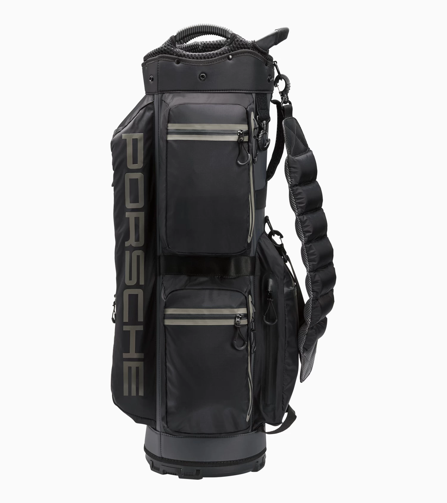 The cart bag is made of coated, water-repellent material and is the ideal caddy on the golf course. Clubs can be optimally organised thanks to its spacious 4-way divider. The bag is particularly easy to transport thanks to the comfortable, balanced and adjustable carrying system. Six pockets and additional umbrella, glove and towel holders offer sufficient storage space for all the essentials. There is a ‘PORSCHE’ silicone print on the side.