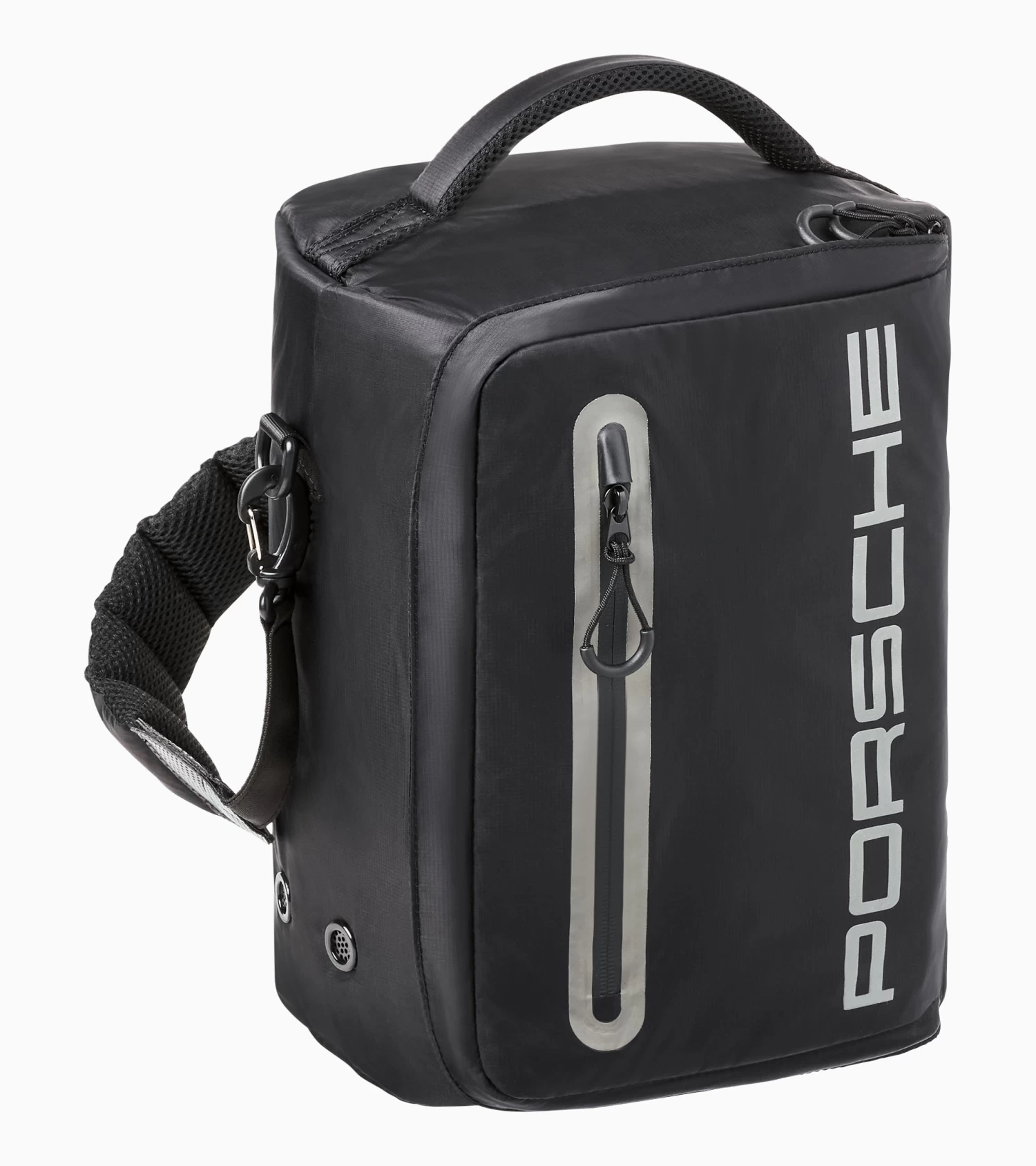 The shoe bag is made of coated, water-repellent material and ensures you can securely and comfortably transport your golf shoes in any weather. Its shoulder strap is softly padded, individually adjustable and even detachable. Two ventilation components prevent unpleasant odours. There is a ‘PORSCHE’ silicone print on the front.