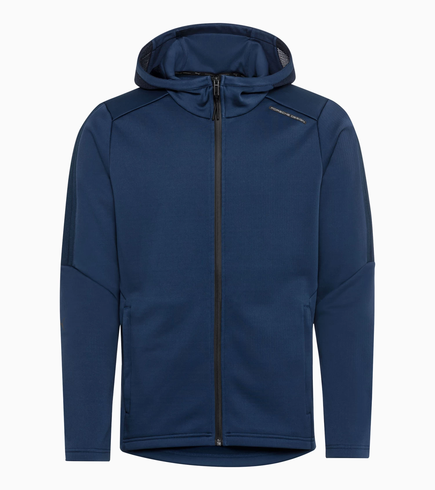 Comfortable and stylish for cooler days: the hoodie with particularly soft material, a comfortable fit and warmCELL® technology. A refined visual detail is the elastic double zip on the sleeve with contrasting mesh underneath that is revealed when stretched. Another highlight is the mesh inserts on the hood, which allow you to wear over-ear headphones. The hooded sweat jacket has two front pockets with zips, two inside pockets and can be closed with a zip on the front. The neck tape with PUMA x Porsche Design print completes the look.