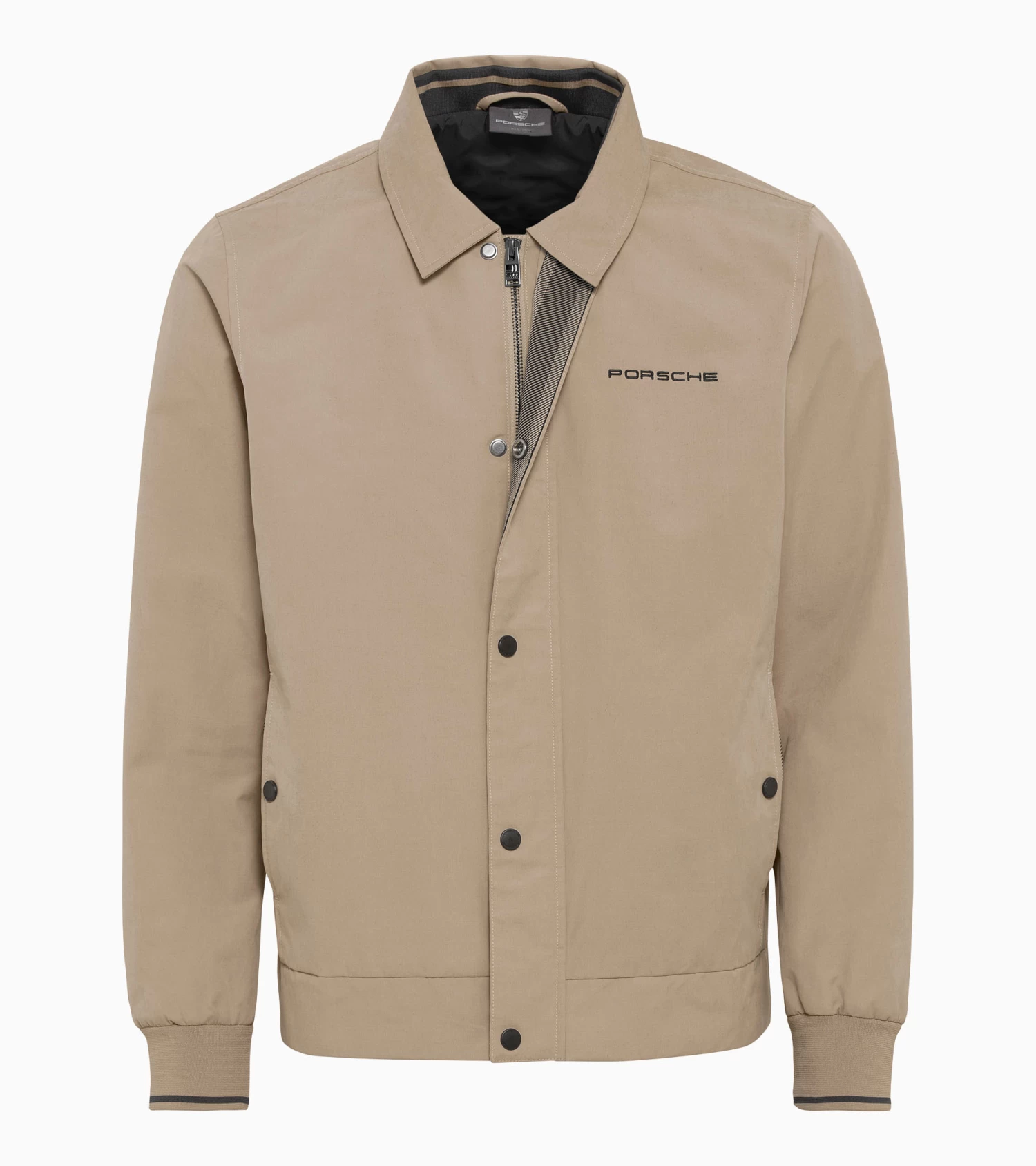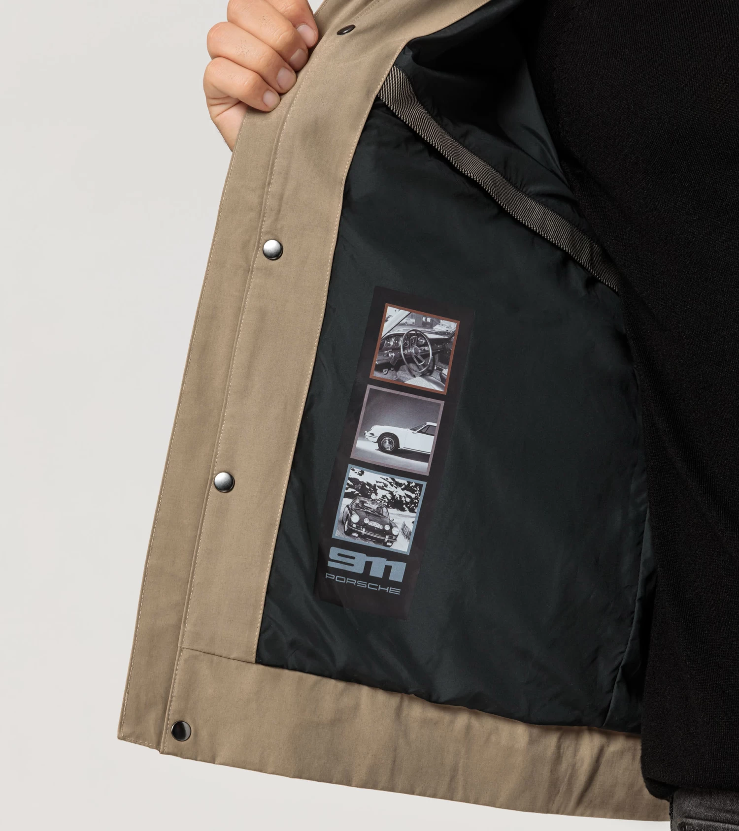 Times change, but the Porsche 911 has remained timeless and modern since 1963 – a true classic. Designed to mark the 60th anniversary of the legendary sports car, the 60Y Porsche 911 collection combines sporty elegance, simple details and high-quality materials in a modern, timeless look – echoing the classic car. The straight-cut jacket truly embodies this timelessness. It scores particularly well with subtle design details such as the embroidered Porsche lettering on the left breast, the small 60Y 911 rivet on the back below the collar and the seam pockets with press studs. The branded, Black press studs set a chic tone. High-quality details such as the stand-up collar that can be folded down and knitted cuffs with a custom-made pattern emphasise the sporty, elegant character of the jacket. For a clean look, the front zip is covered by the button placket, which has custom-made tape on the inside. The lined jacket inner with two pockets ensures optimum wearing comfort and features a large 60Y 911 print and a 911 image print on the right.