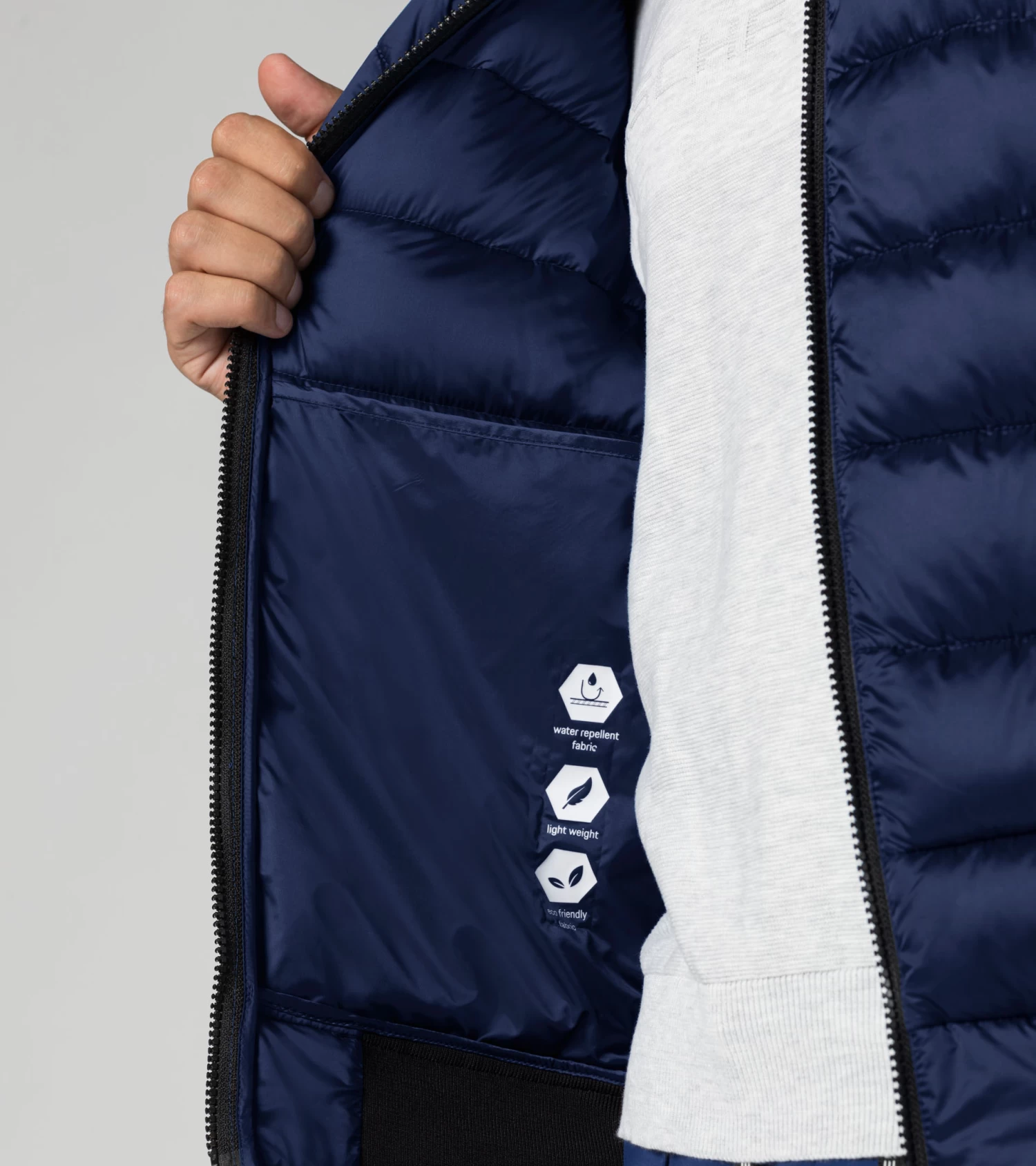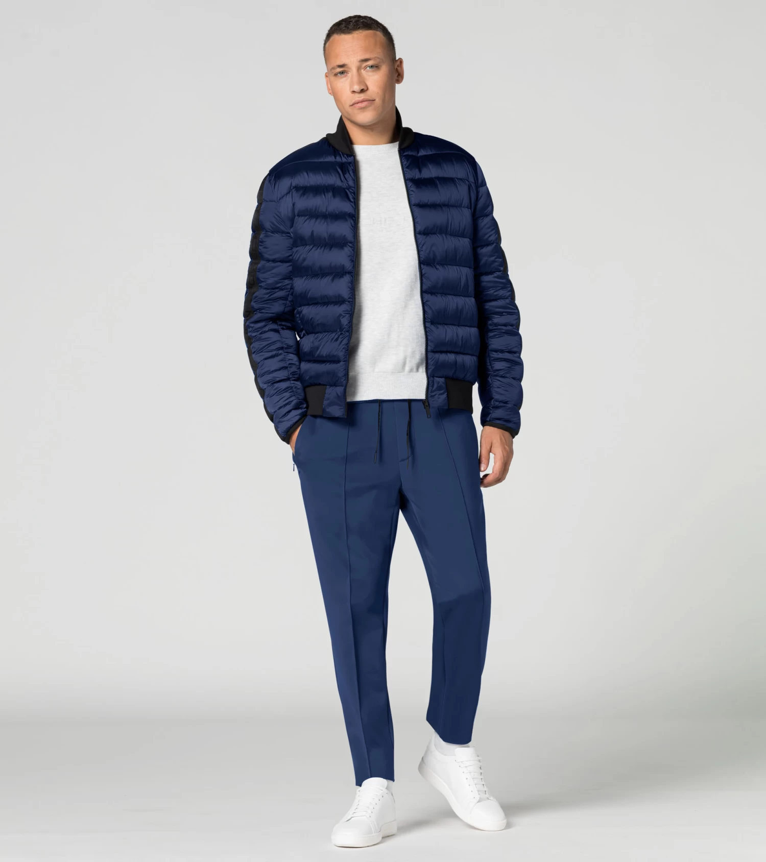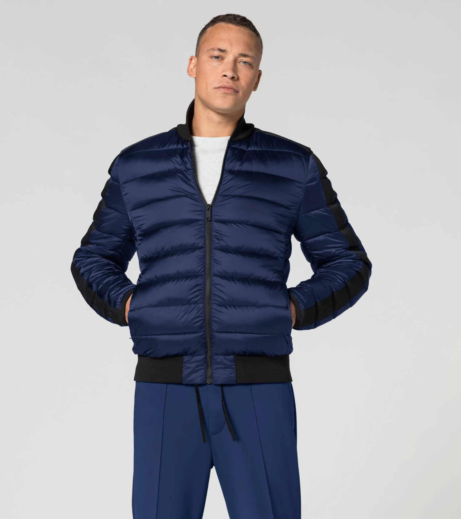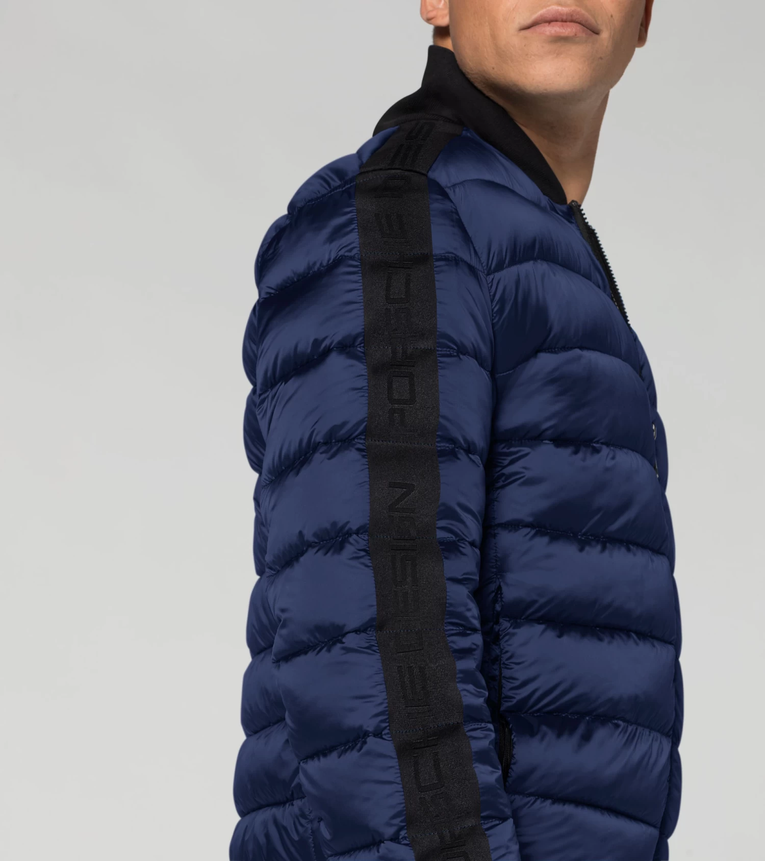 Lighter in winter: the lightweight Porsche Design jacket combines the latest production technology with exclusive design. The one thing that stands out above all is the fact that the jacket is particularly light due to the down-free filling from a special fibre filling machine. Externally, small horizontal quilting will impress, while on the inside it features sandwich quilting and two pockets. A foldable circular knit collar and elastic cuffs on the sleeves offer protection from the cold. Specially made zips andelastic cuffs with the Porsche Design logo on the shoulders and sleeves complete the look.