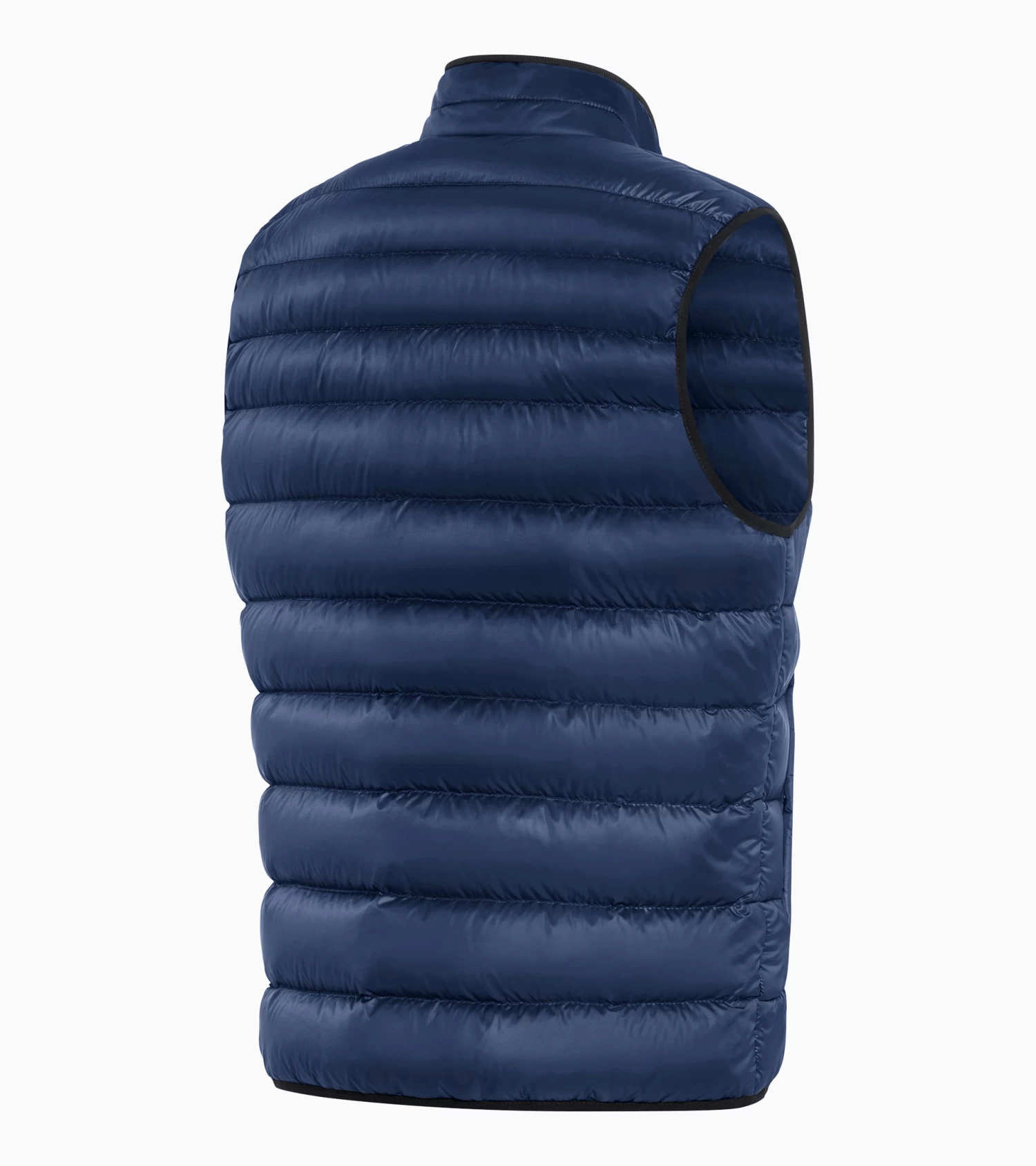 Light as a feather – without any feathers: the straight-cut quilted vest with down-free filling is perfect for the transitional seasons and can also be worn over a warm sweater. The two pockets at hip height can be closed with press studs, the pockets on the inside with zips. Refined details typical of Porsche include the knitted fabric on the inside of the stand-up collar and the Porsche Design tape on the front of the vest.