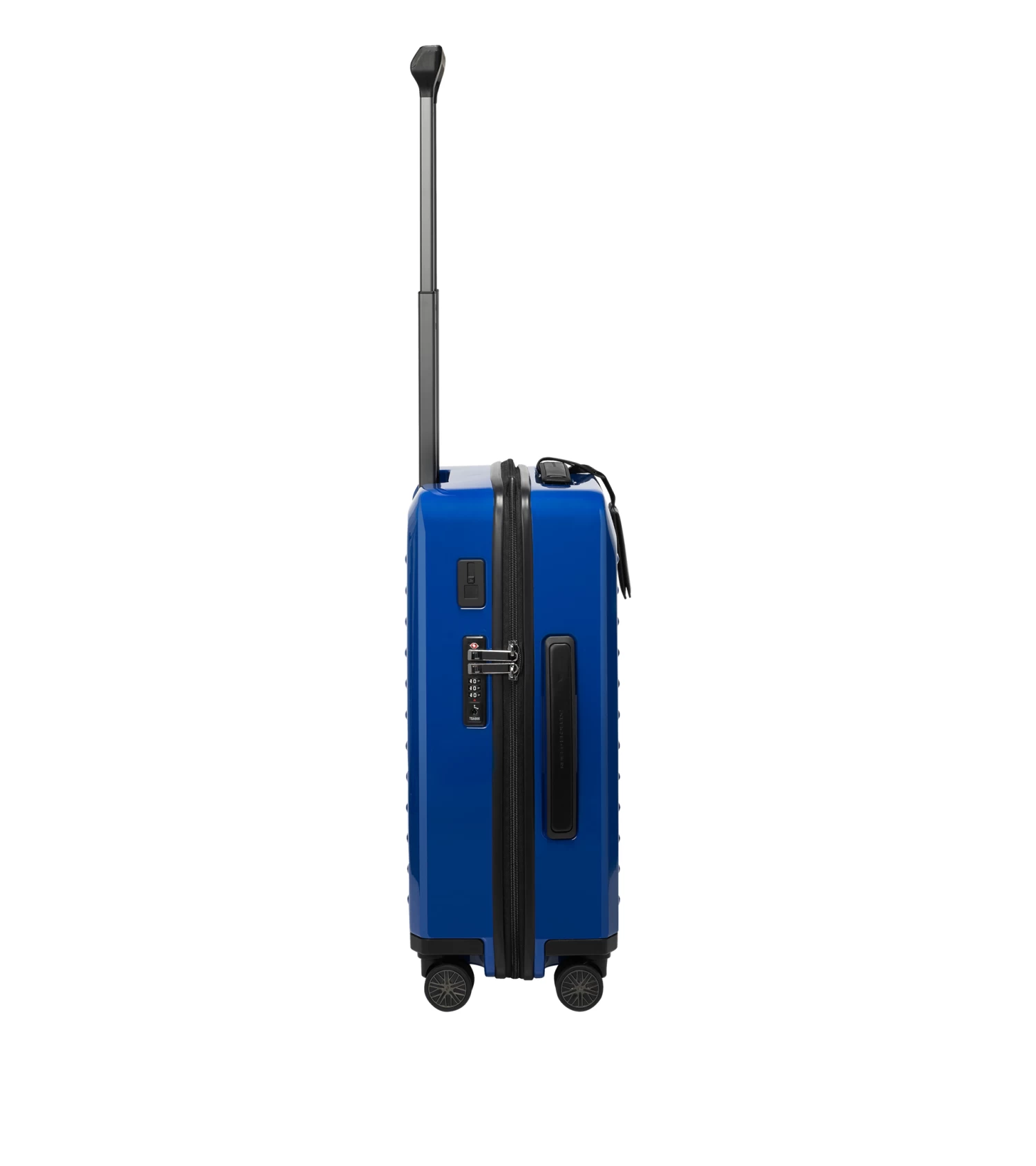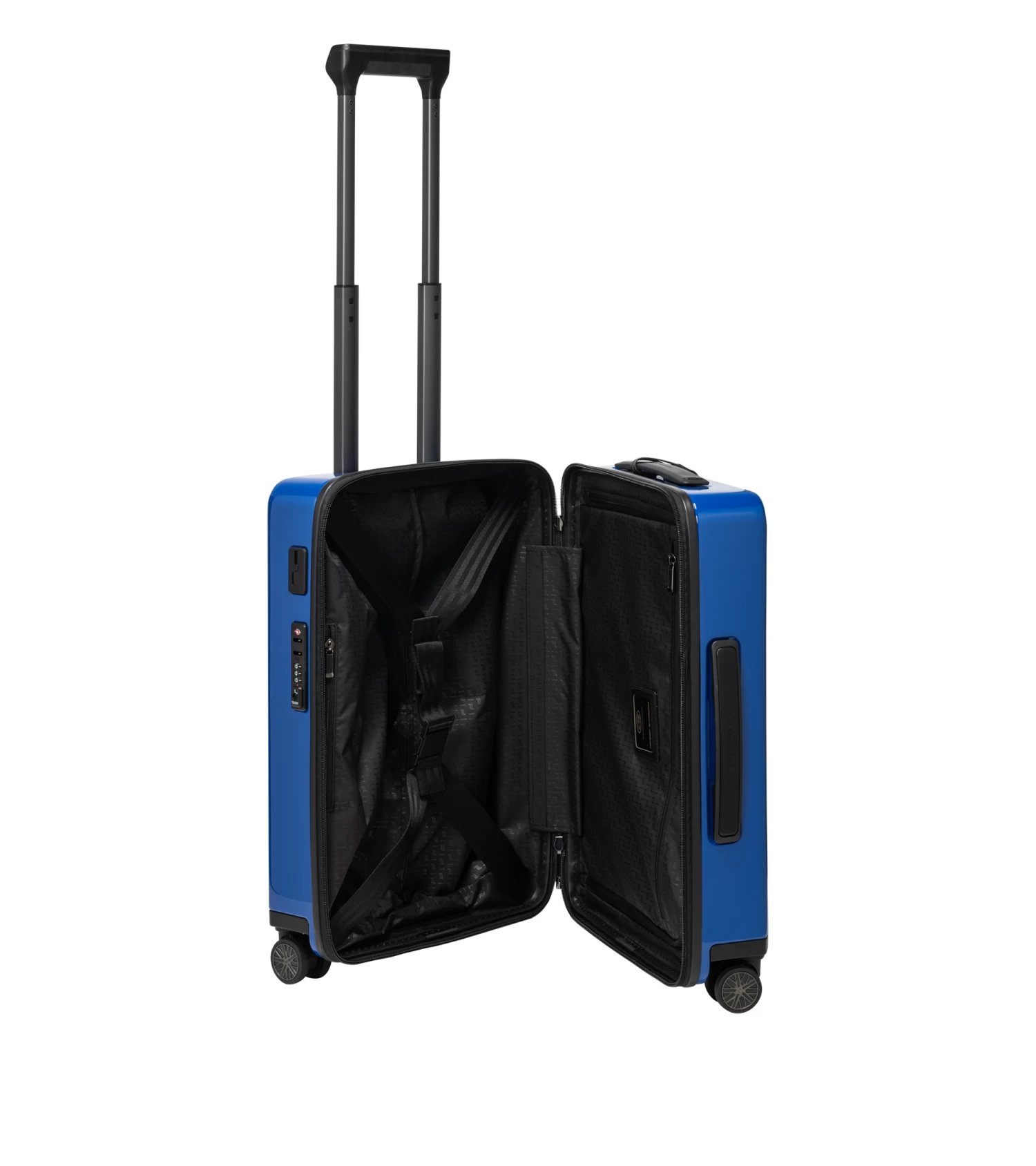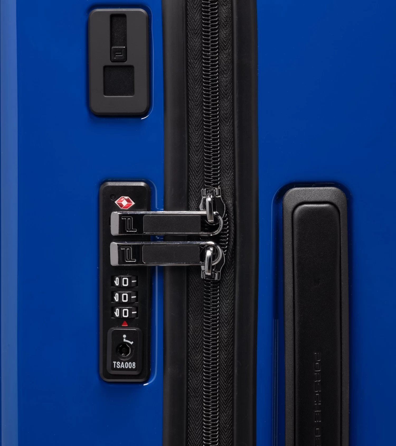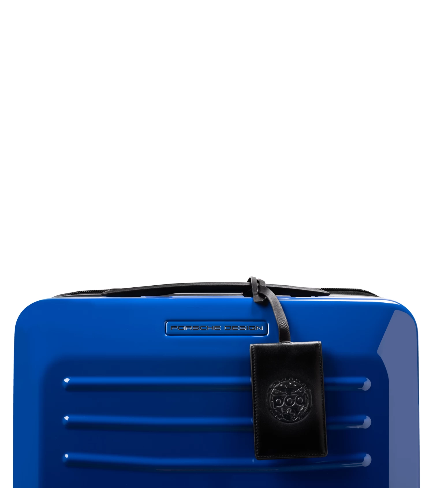 PCA Member Exclusive – available only to Porsche Club of America members. Limited-edition 4-wheeled designer trolley in ultra-lightweight plastic in exclusive Clubblau and exclusive, numbered leather luggage tag with PCA logo debossing. The Roadster Hardcase collection in polycarbonate designed by Studio F. A. Porsche is the perfect fusion of form, function and design. The cabin-sized Porsche Design Roadster Hardcase 4W Business Trolley S catches the eye with a weight of just 3.0 kg and its dynamic monochrome look with Porsche signature details. Ball-bearing-mounted, smooth-rolling wheels in the style of the Porsche Taycan rims and an ergonomic multi-height handle ensure optimum performance. Bags can be effortlessly placed and removed over the rounded edges of the handle. The divided interior is lined with signature PD fabric—and is protected by an ultra-secure two-way zipper and a TSA-approved lock.
