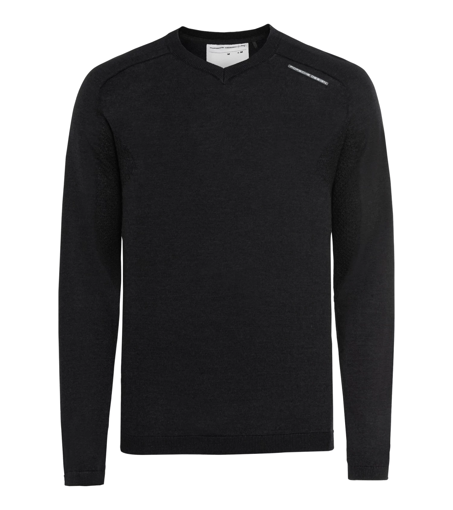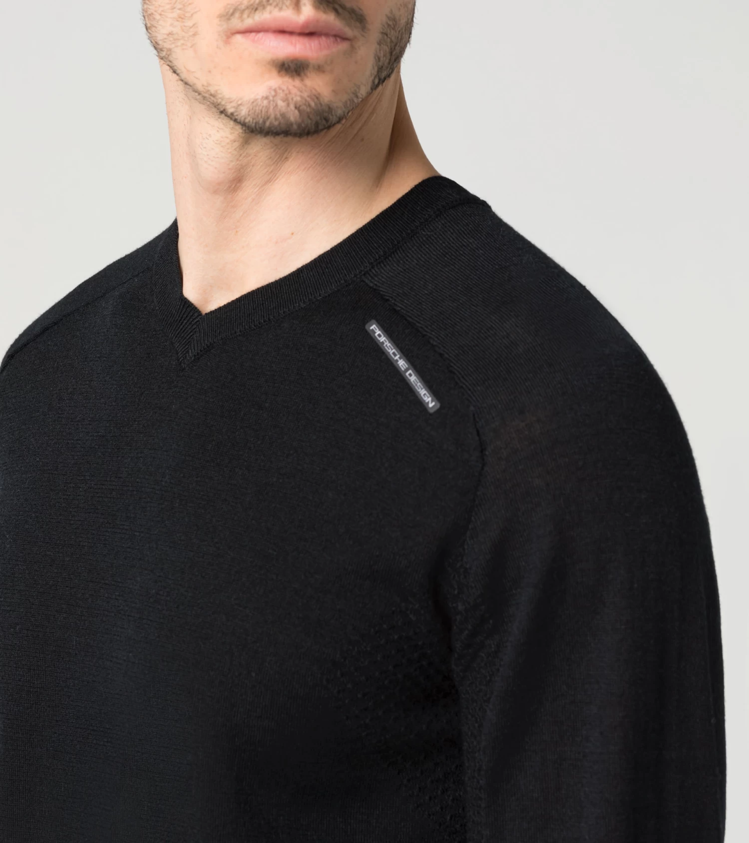 A potential classic for anyone who doesn’t wear classic pullovers: the Porsche Design EvoKNIT® V-neck made from high-performance knitted fabric takes the evergreen V-neck pullover to a new level. The innovative EvoKNIT® technology combines the comfort of the high-quality fabric, made from warm merino wool and recycled material, with functional, seamlessly knitted-in ventilation zones in a mesh structure under the arms and on the back. The lines inspired by Porsche Motorsport give the sweatshirt a dynamic character, supported by a movement-optimized raglan sleeve construction and details such as knitted cuffs and the contrasting Porsche Design logo. The definitive pullover.
