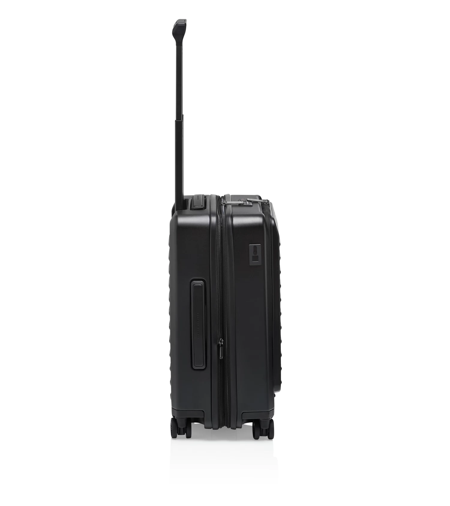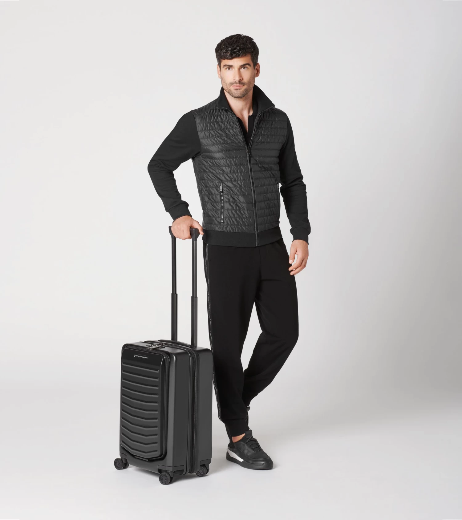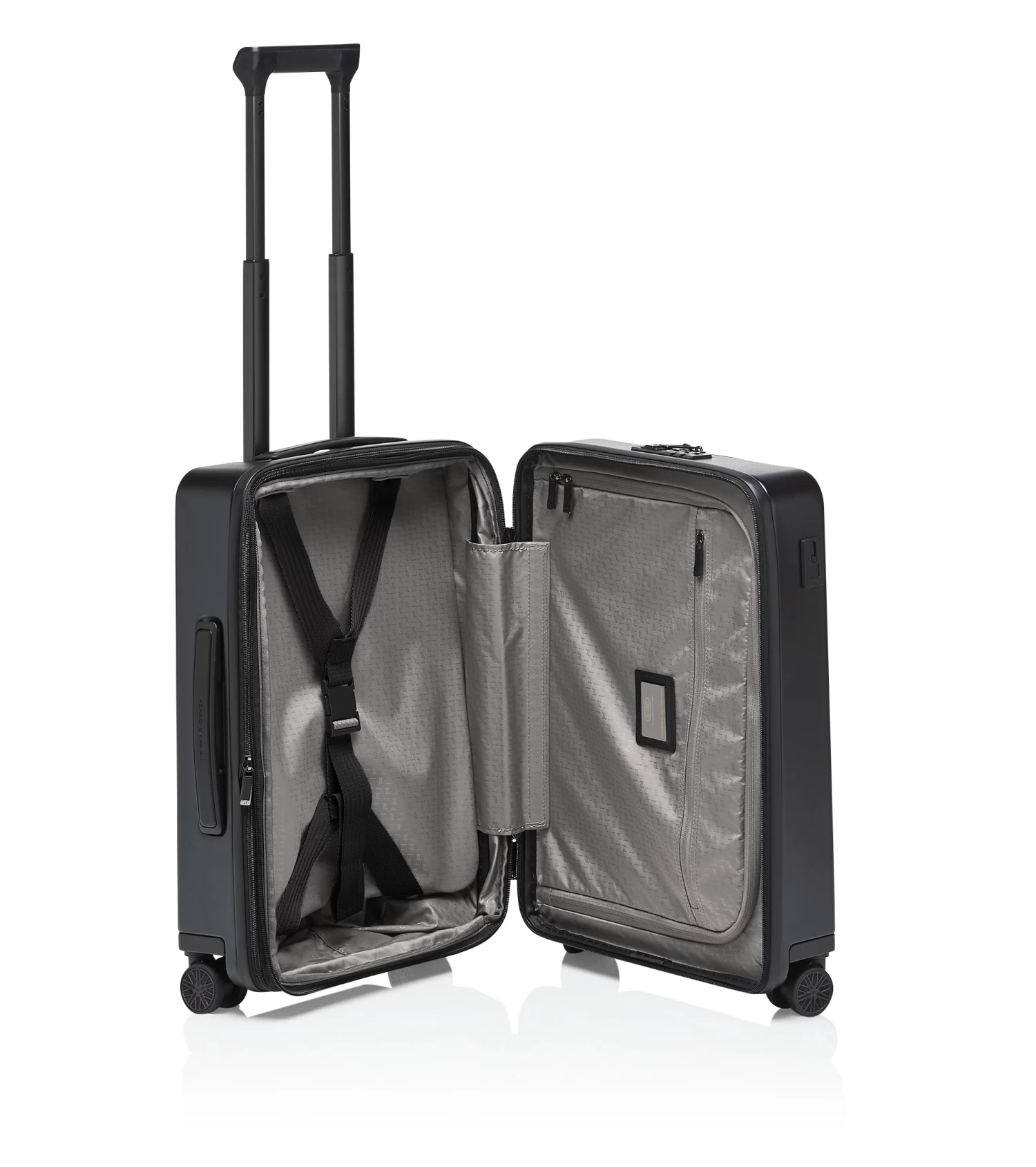 Ultra lightweight and inspired by the colors of the Porsche 911: the Roadster Hardcase collection. The case series in polycarbonate designed by Studio F. A. Porsche is the perfect fusion of form, function and design. The Porsche Design Roadster Hardcase 4W Business Trolley S in cabin luggage size catches the eye with its well thought-out design, a weight of just 3.9 kg and a dynamic monochrome look with signature Porsche details. The roomy front pocket with business features and a USB port offers ample space for a notebook, documents and extras which you’d like to access quickly at the airport. Ball-bearing-mounted, smooth-rolling wheels in the style of the Porsche Taycan rims and an ergonomic multi-height handle ensure optimum performance. Bags can be effortlessly placed and removed over the rounded edges of the handle. The divided interior can easily be expanded at any time and, like the front pocket, is protected by a double TSA-approved lock and an anti-theft zipper.