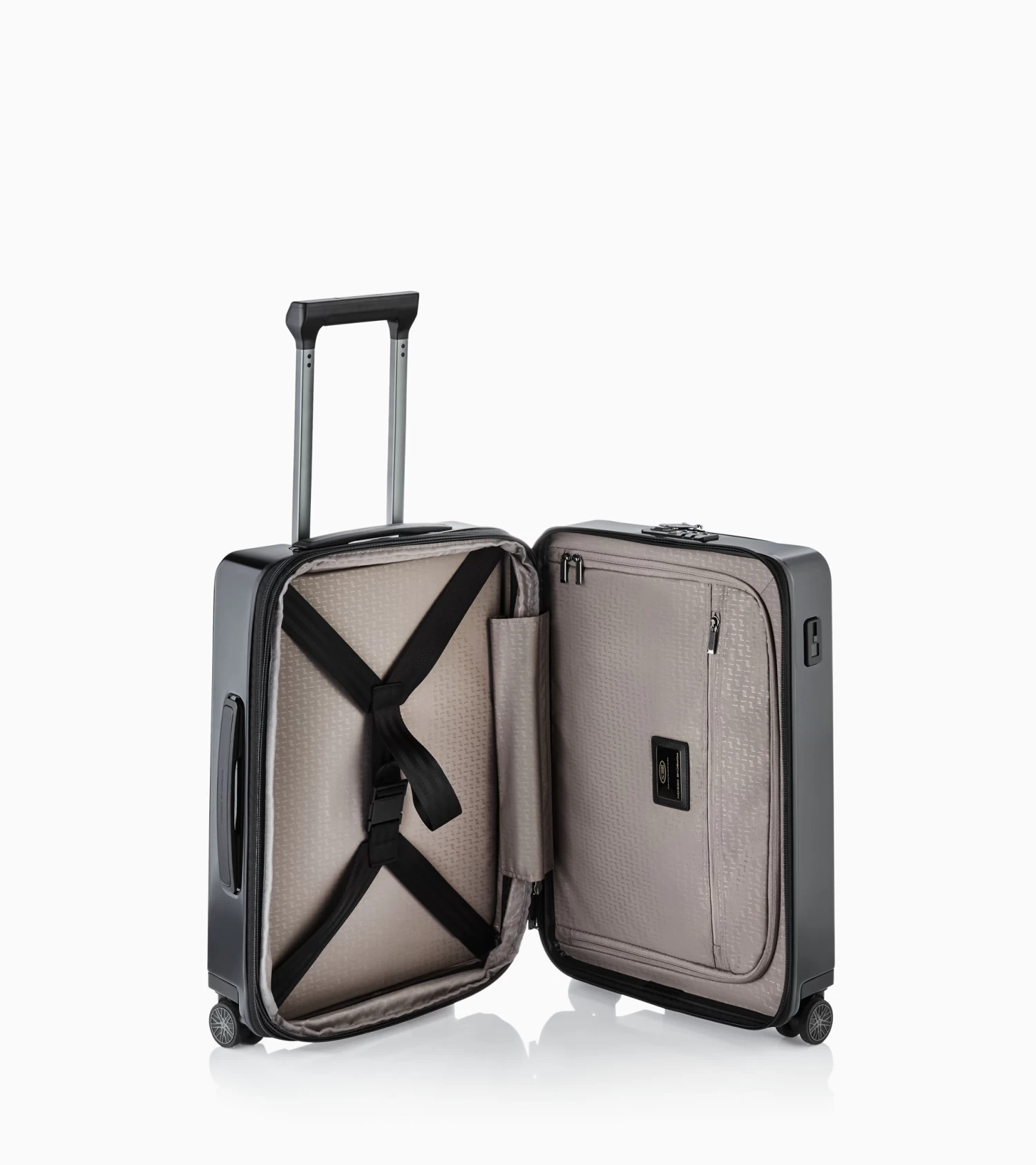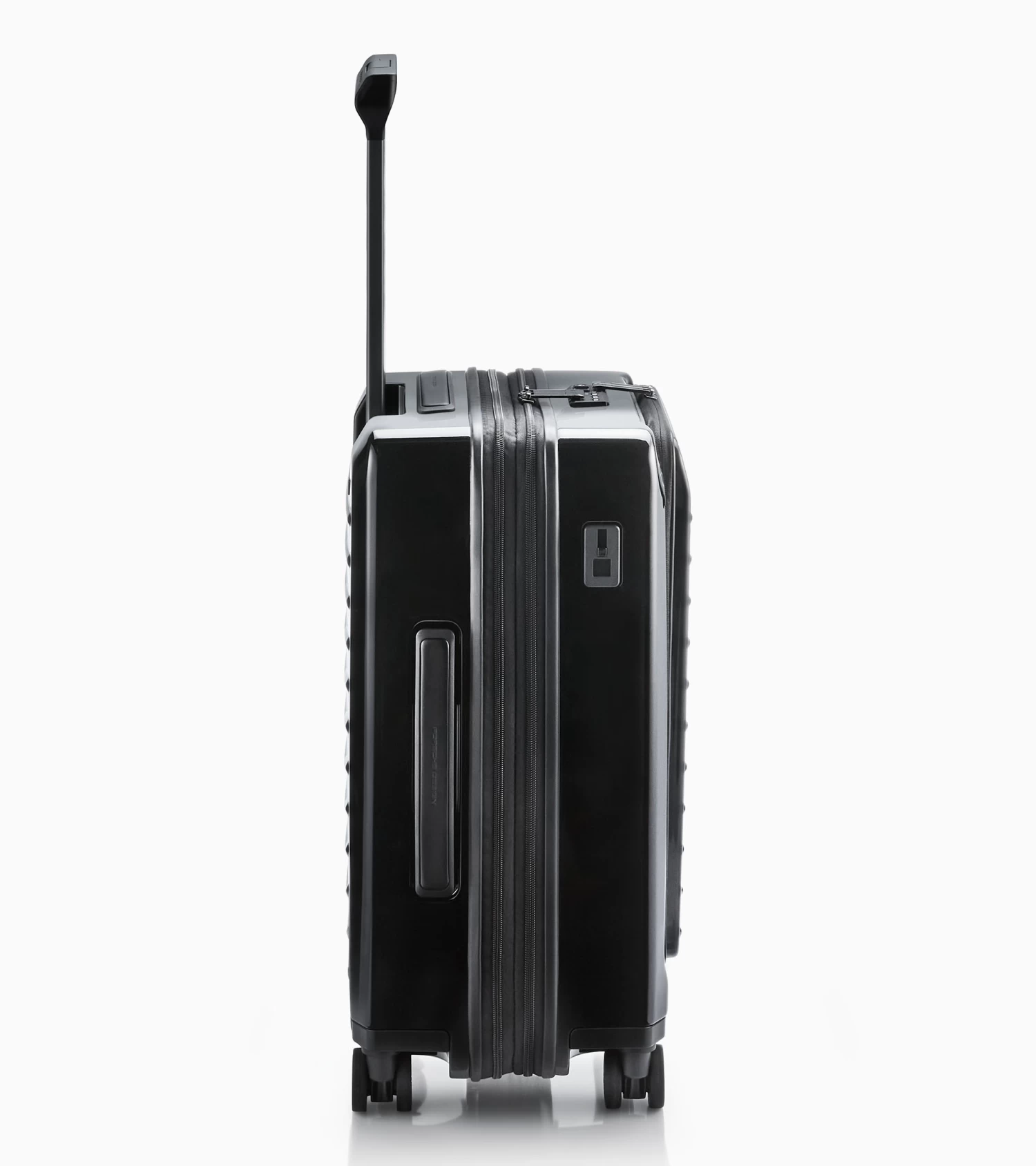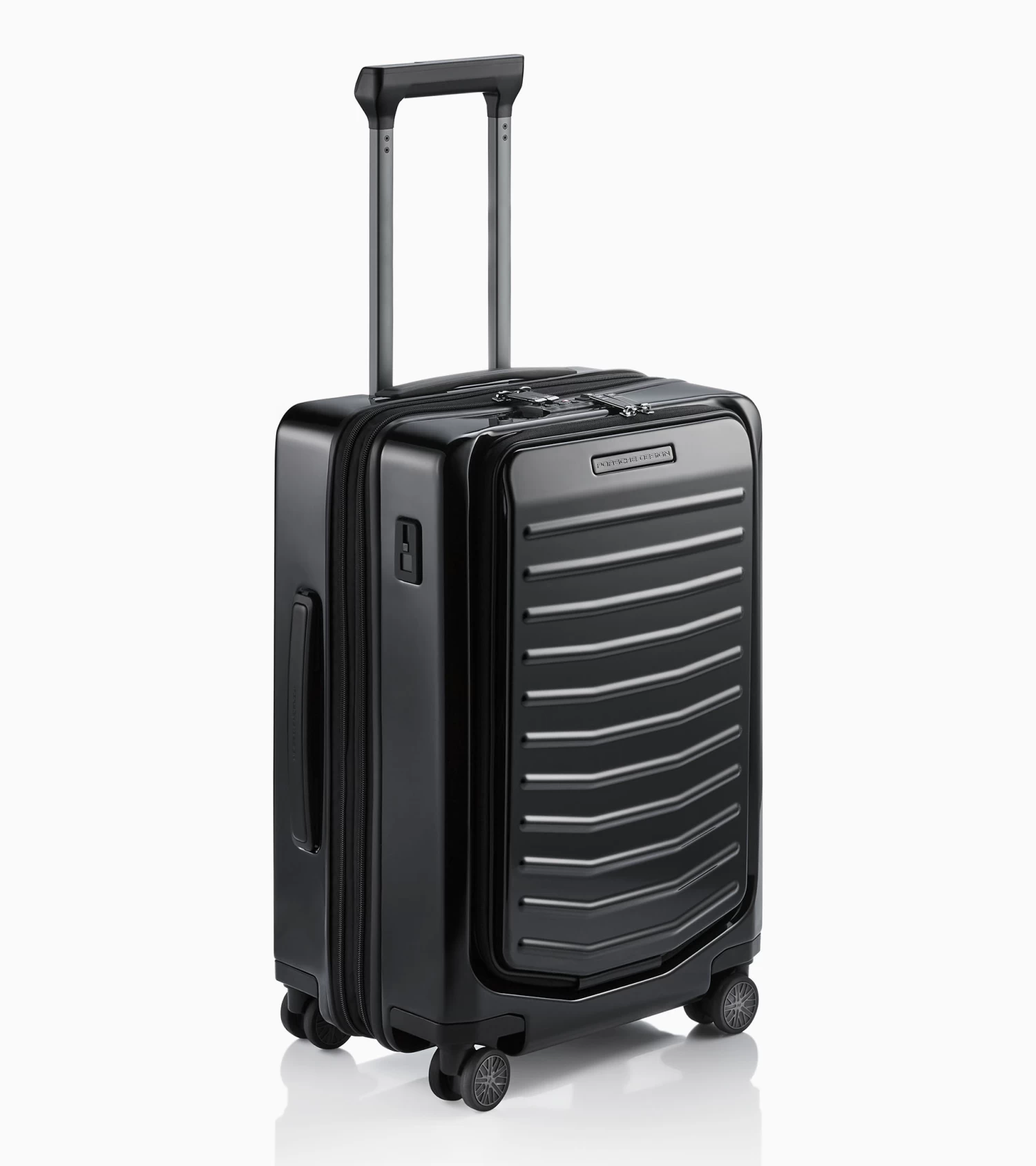 Ultra lightweight and inspired by the colors of the Porsche 911: the Roadster Hardcase collection. The case series in polycarbonate designed by Studio F. A. Porsche is the perfect fusion of form, function and design. The Porsche Design Roadster Hardcase 4W Business Trolley S in cabin luggage size catches the eye with its well thought-out design, a weight of just 3.9 kg and a dynamic monochrome look with signature Porsche details. The roomy front pocket with business features and a USB port offers ample space for a notebook, documents and extras which you’d like to access quickly at the airport. Ball-bearing-mounted, smooth-rolling wheels in the style of the Porsche Taycan rims and an ergonomic multi-height handle ensure optimum performance. Bags can be effortlessly placed and removed over the rounded edges of the handle. The divided interior can easily be expanded at any time and, like the front pocket, is protected by a double TSA-approved lock and an anti-theft zipper.