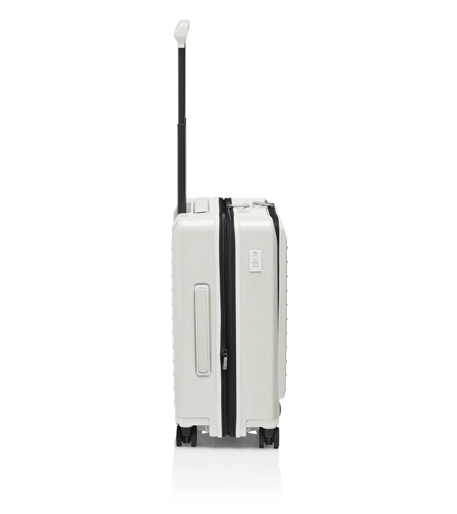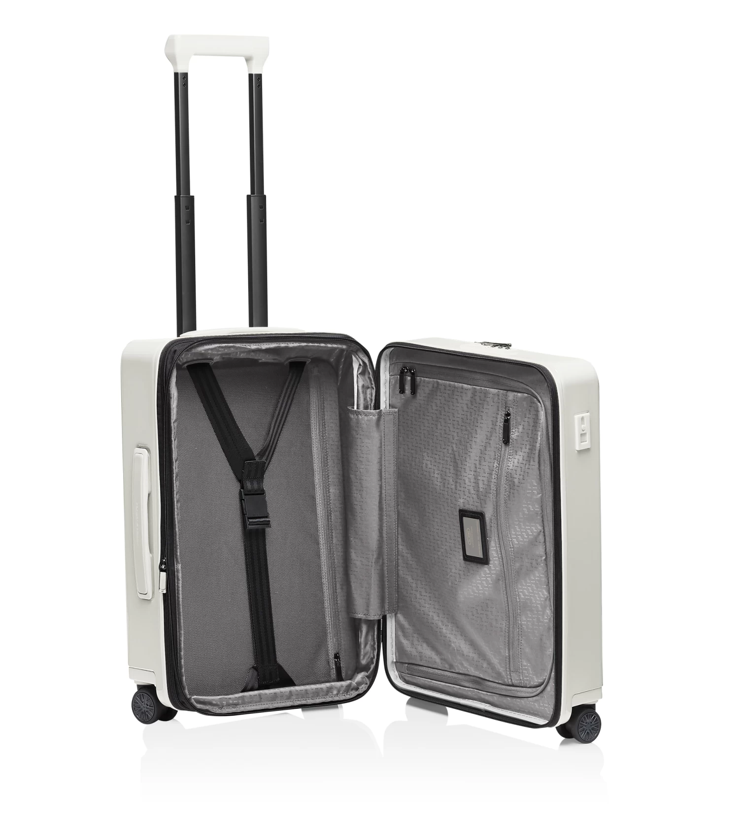 Ultra lightweight and inspired by the colors of the Porsche 911: the Roadster Hardcase collection. The case series in polycarbonate designed by Studio F. A. Porsche is the perfect fusion of form, function and design. The Porsche Design Roadster Hardcase 4W Business Trolley S in cabin luggage size catches the eye with its well thought-out design, a weight of just 3.9 kg and a dynamic monochrome look with signature Porsche details. The roomy front pocket with business features and a USB port offers ample space for a notebook, documents and extras which you’d like to access quickly at the airport. Ball-bearing-mounted, smooth-rolling wheels in the style of the Porsche Taycan rims and an ergonomic multi-height handle ensure optimum performance. Bags can be effortlessly placed and removed over the rounded edges of the handle. The divided interior can easily be expanded at any time and, like the front pocket, is protected by a double TSA-approved lock and an anti-theft zipper.
