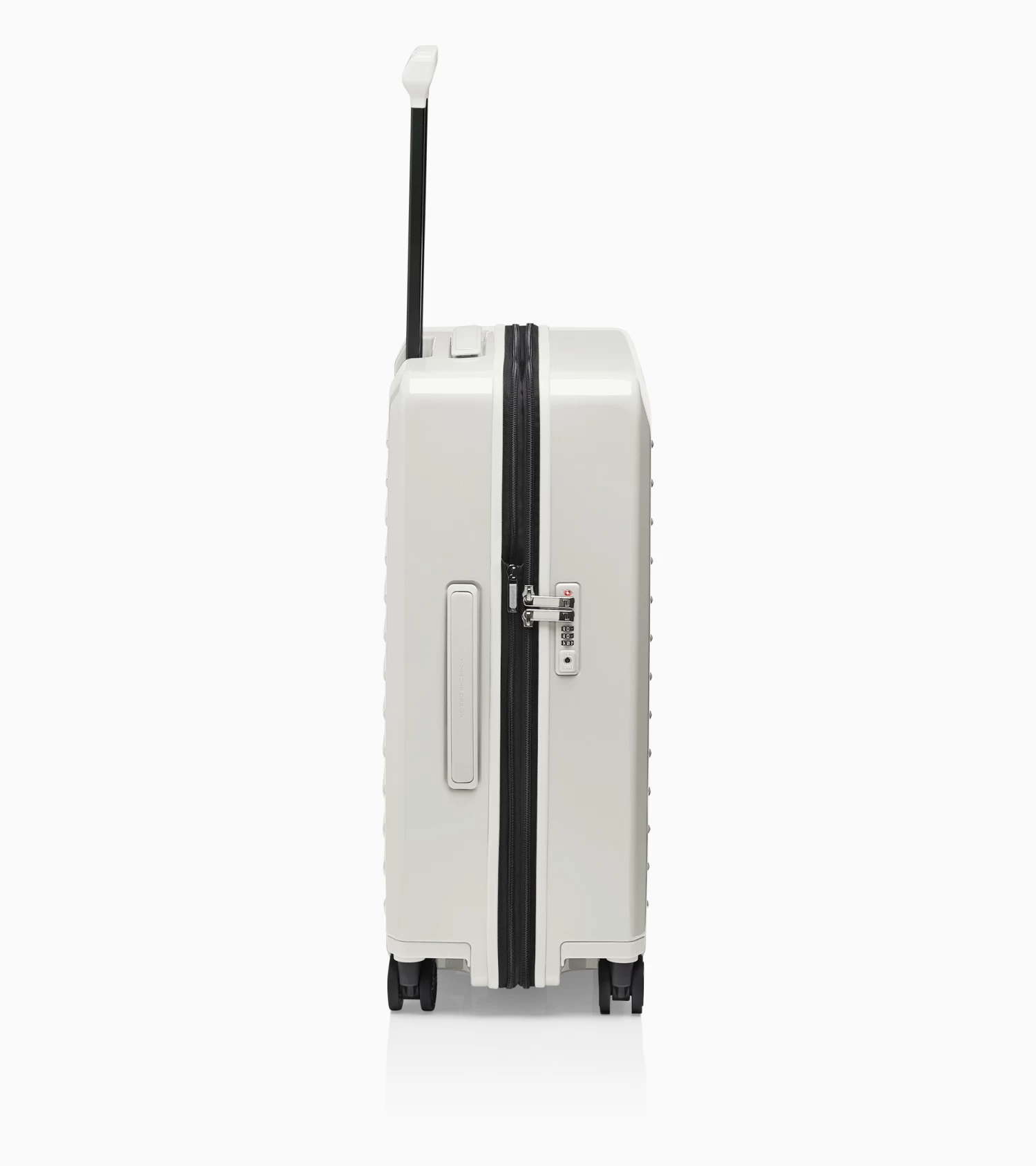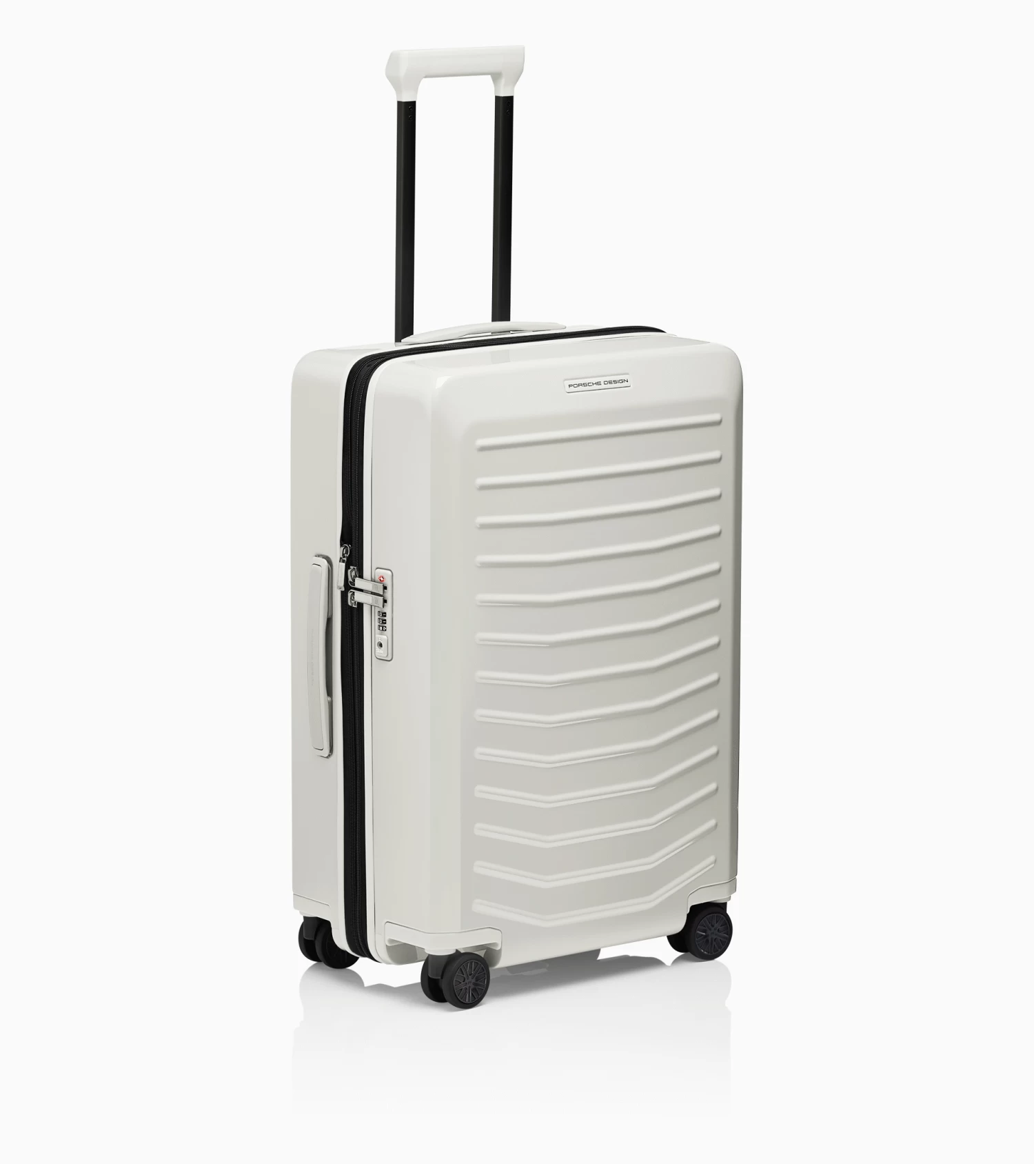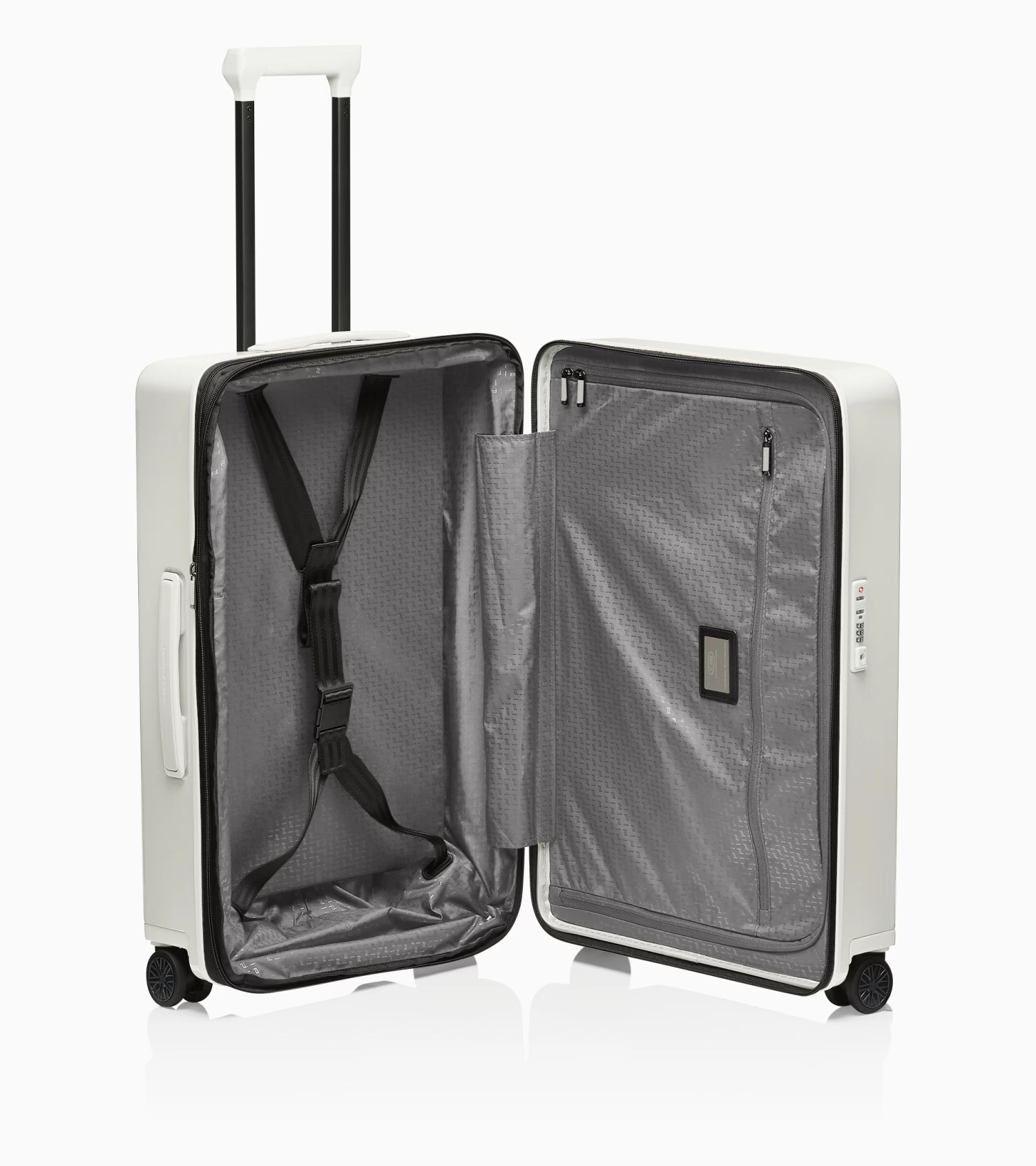 Ultra lightweight and inspired by the colors of the Porsche 911: the Roadster Hardcase collection. The case series in polycarbonate designed by Studio F. A. Porsche is the perfect fusion of form, function and design. The medium Porsche Design Roadster Hardcase 4W Business Trolley L catches the eye with a weight of just 4.1 kg and its dynamic monochrome look with Porsche signature details. Ball-bearing-mounted, smooth-rolling wheels in the style of the Porsche Taycan rims and an ergonomic multi-height handle ensure optimum performance. Bags can be effortlessly placed and removed over the rounded edges of the handle. The divided interior is also flexible—and can easily be expanded at any time. An ultra-secure two-way zipper and a TSA-approved lock protect your luggage.