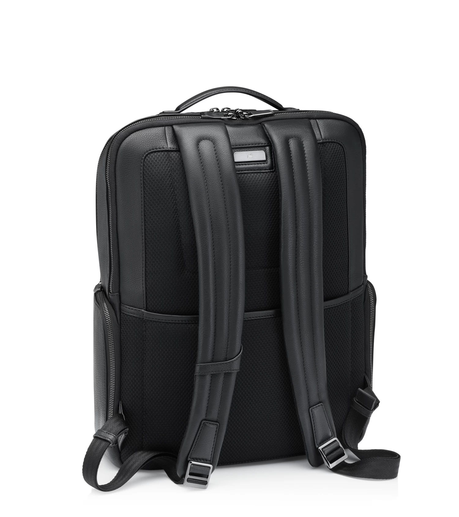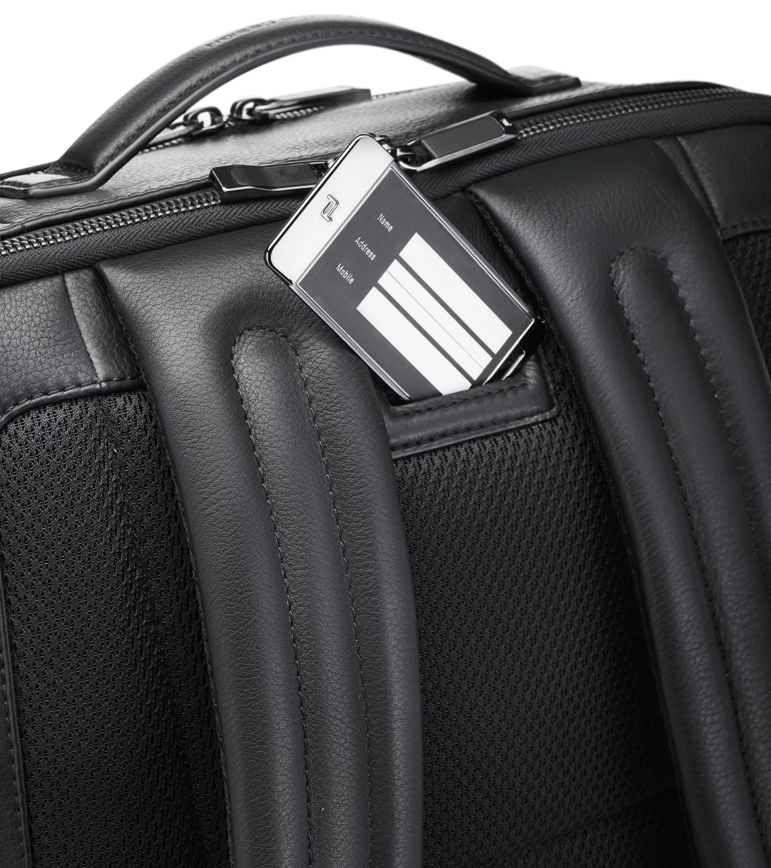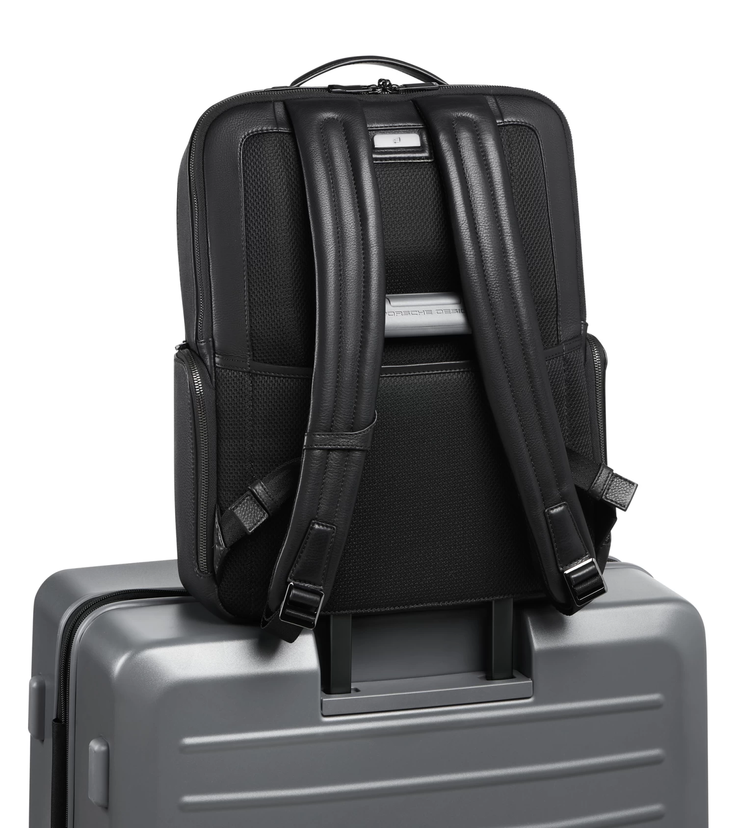 There is ample space for all those little essentials in the separate front compartment with business organizer, the additional front pocket, and the zippered side pockets. Valuables such as keys can be stowed in the pocket concealed in the trolley link. A padded back and softly padded shoulder straps ensure that this leather rucksack is exceptionally comfy to wear despite its generous size.