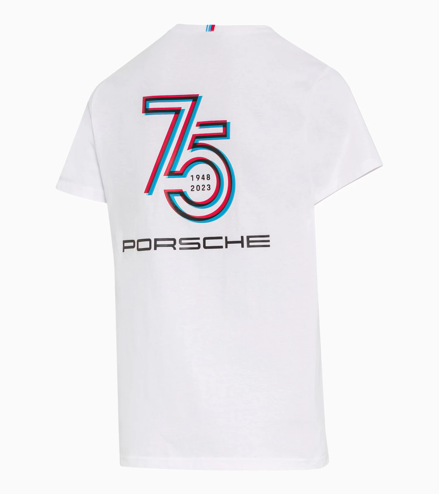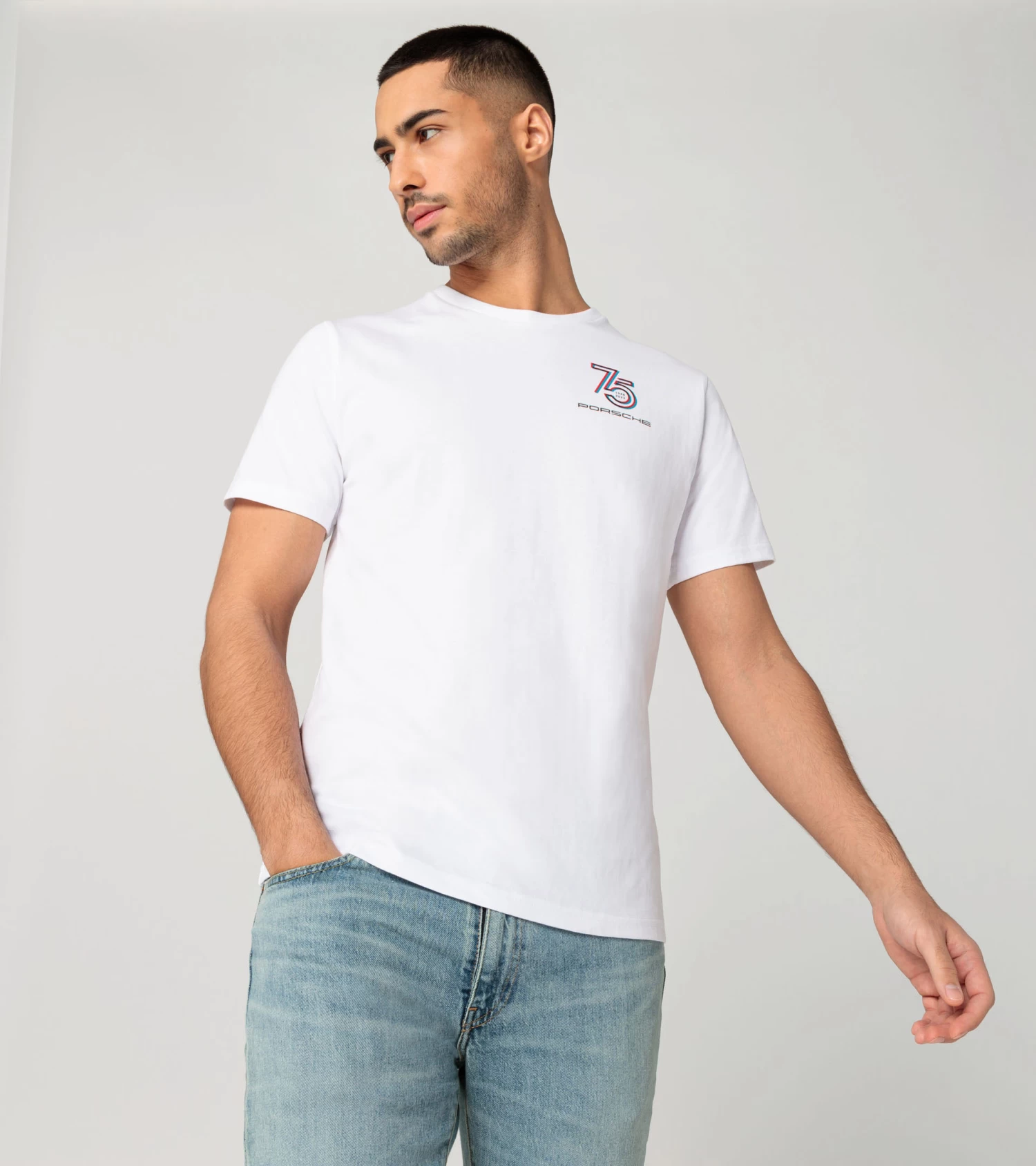 The unique anniversary collection honours the birth of the brand in 1948, marking the date when the first Porsche sports car received its general operating licence on 8 June, 1948. The ’75’ adorns the front and back of the ’75Y’ T-shirt made of soft cotton, on the front as a small screen print, on the back as a large, complex 3D print including the years.The ‘PORSCHE’ lettering appears below the number on the front and back. A small striped band on the neck in the anniversary colours rounds off the detailed design.