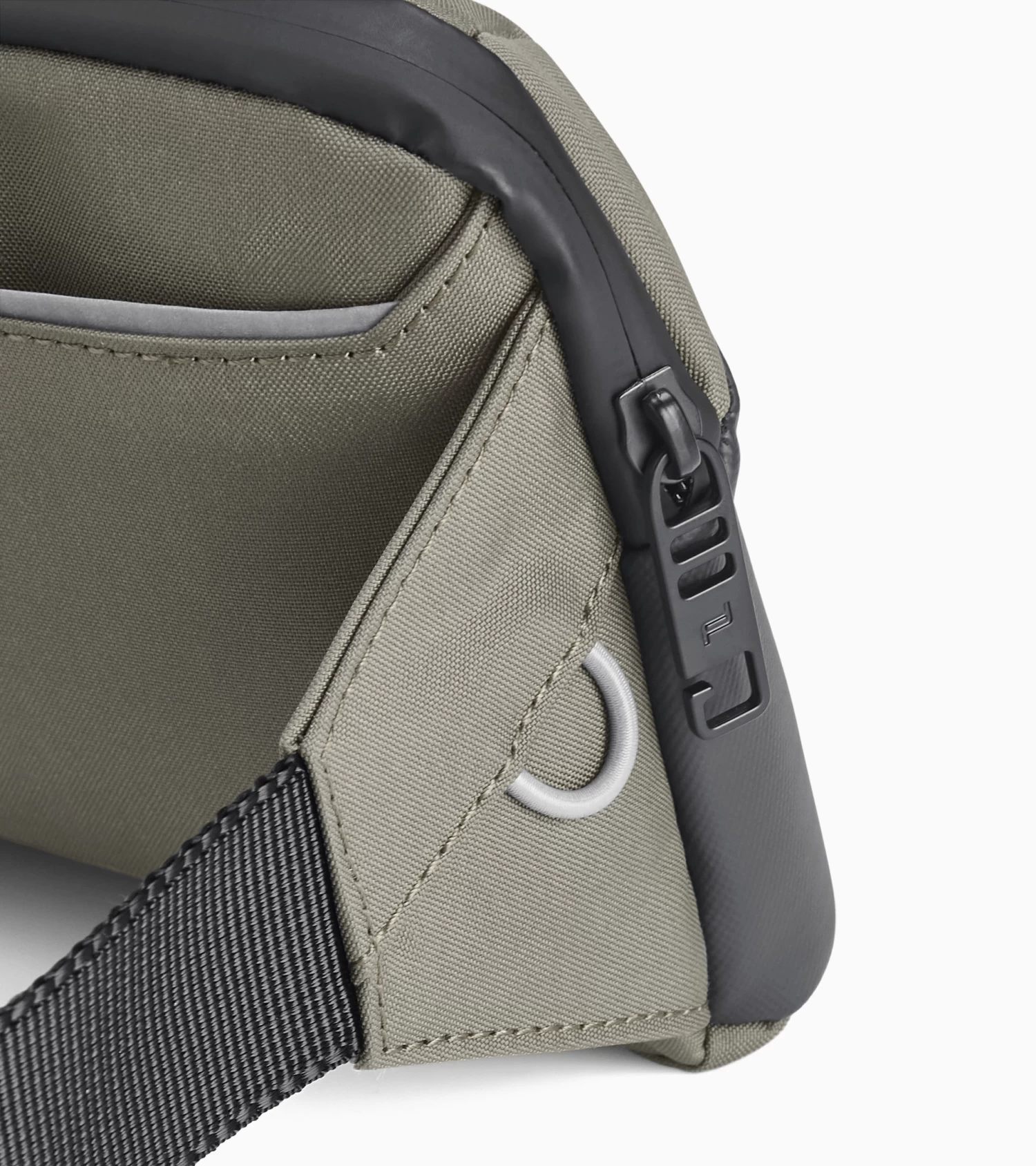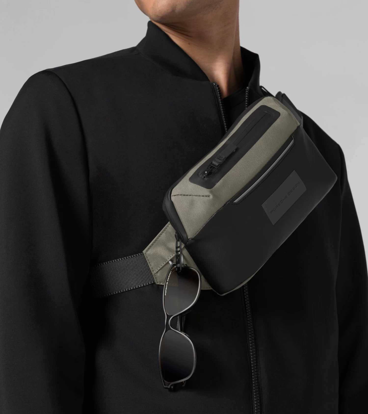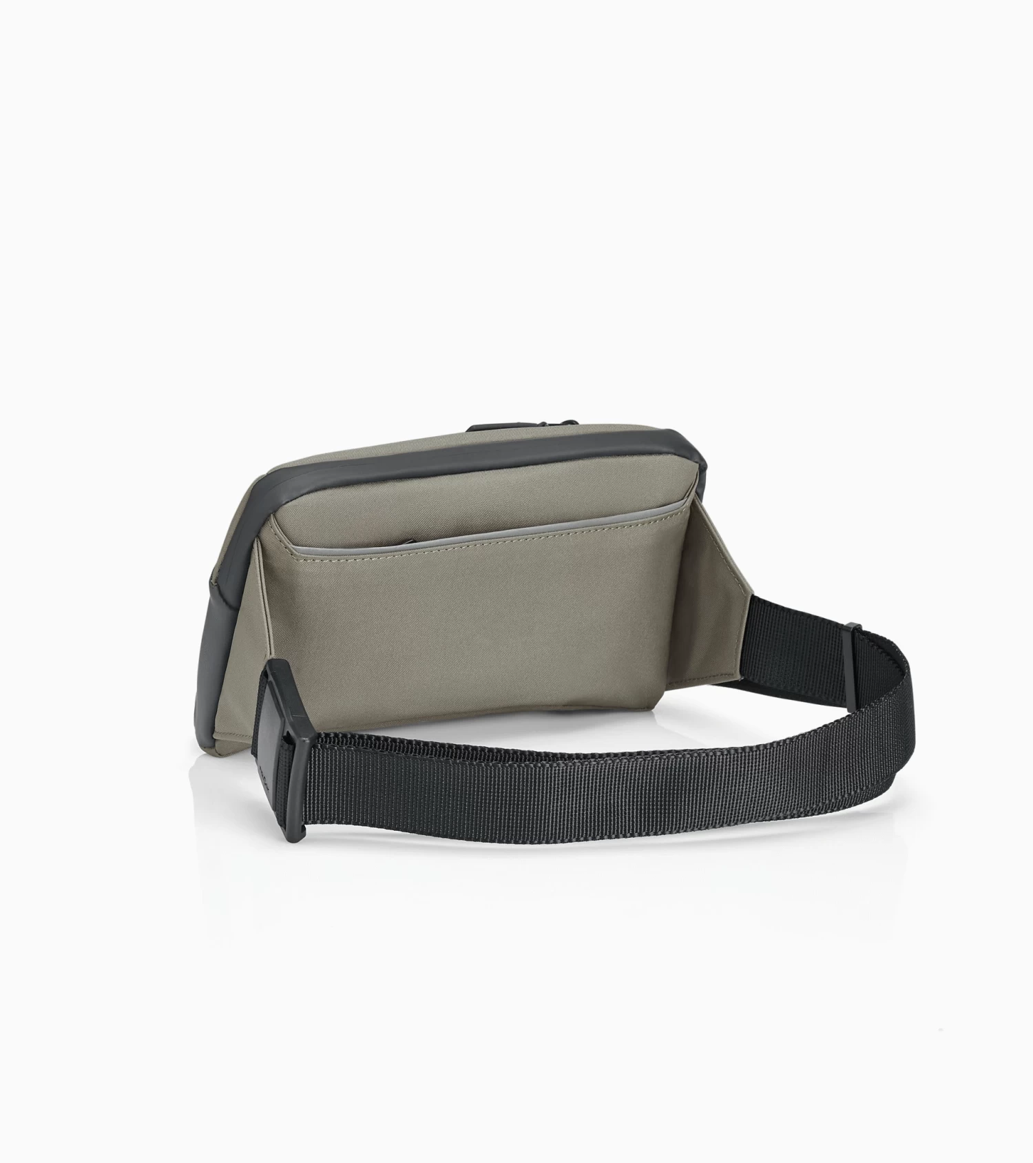 Now also in Stone Grey! The Porsche Design Urban Eco series combines style and sustainability, functionality and flexibility, business and travel. The modern bags and accessories won’t end up in the drawer so they’re perfect for modern everyday life. Like the Porsche Design Urban Eco Belt Bag. Whether worn as a crossbody bag or traditionally around your hip: The belt bag shows that functionality and style are not a matter of size. You notice the clean design first of all. An exciting mix of water-repellent polyester and coated fabric with laminated zippers, black metal fittings, and a rubberized logo patch. Not immediately visible, but unmistakably exclusive: the PD icon lining with hexagon pattern and the Porsche model badge-inspired back print with the Zell am See map coordinates, the home of Studio F. A. Porsche. A highly functional design waits behind the technical, cool look. The car-inspired belt clasp is positioned near the bag, unlike with most belt bags, in order to ensure easy handling, maximum security, and a high level of comfort. The length-adjustable belt makes it possible to wear it in different ways. The features are smart too: A main compartment with a zipper, an additional zipper pouch in front, an insertion pocket with reflective piping on the back, and an external ring for an additional pouch or carabiner provide structure—with style.